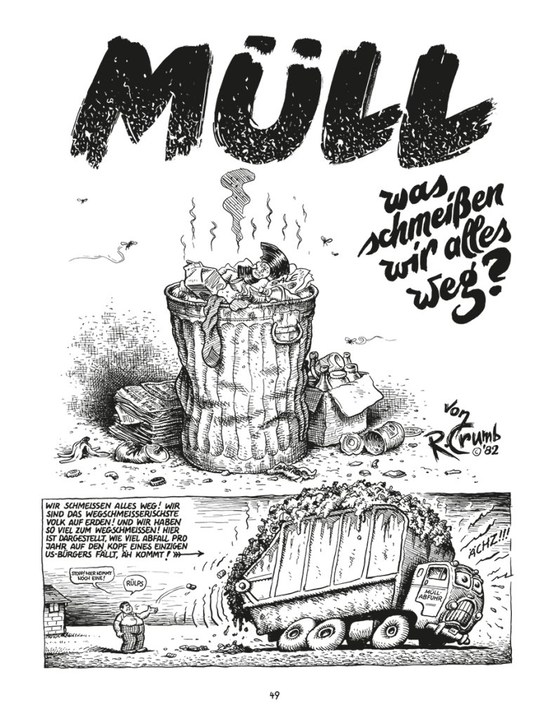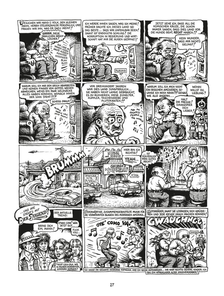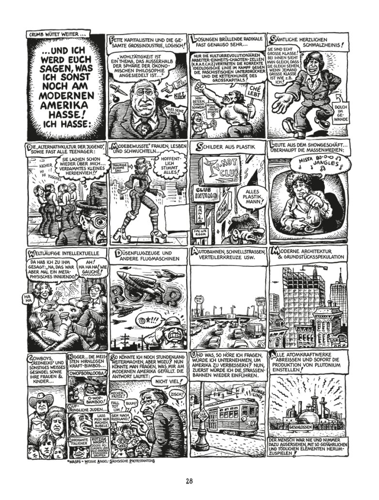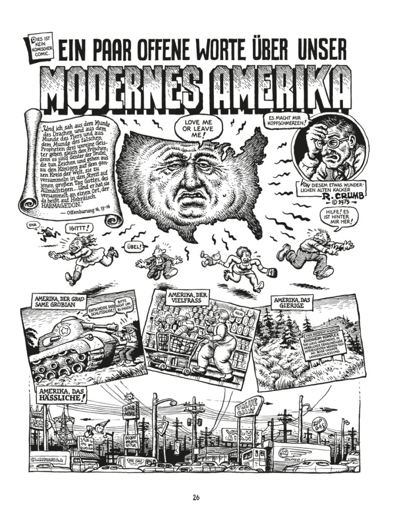 Vom Leiden des kleinen Mannes im Korsett der Nine-to-Five-Jobhölle über schwadronierende Vorstadtfaschisten bis hin zum zweifelhaften Einfluss profitgieriger Immobilienmagnate am Beispiel Donald Trumps – pointiert zeigt Robert Crumb die Abgründe der westlichen Moderne und geizt nicht mit bissigen Zuspitzungen und provokanten Stereotypen.