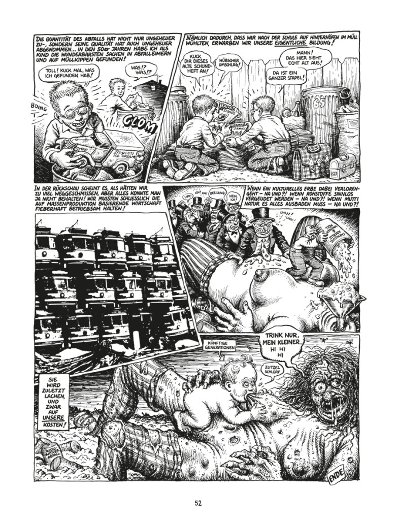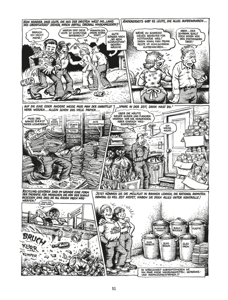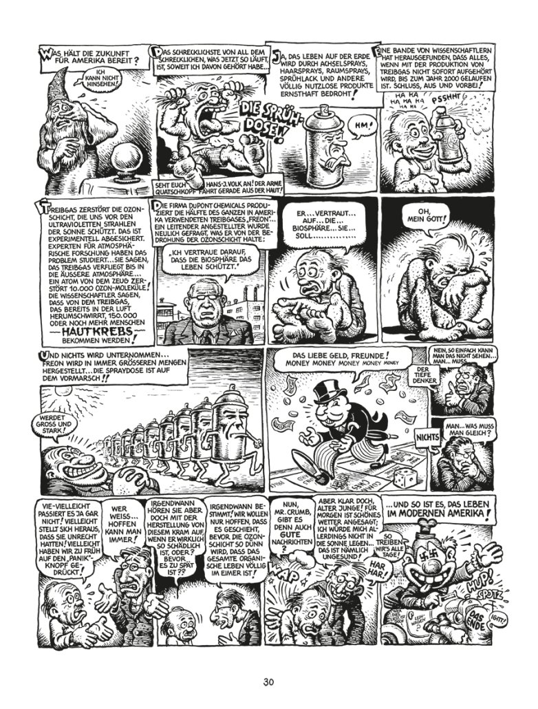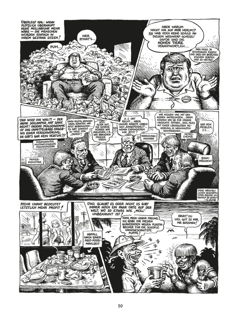 Vom Leiden des kleinen Mannes im Korsett der Nine-to-Five-Jobhölle über schwadronierende Vorstadtfaschisten bis hin zum zweifelhaften Einfluss profitgieriger Immobilienmagnate am Beispiel Donald Trumps – pointiert zeigt Robert Crumb die Abgründe der westlichen Moderne und geizt nicht mit bissigen Zuspitzungen und provokanten Stereotypen.