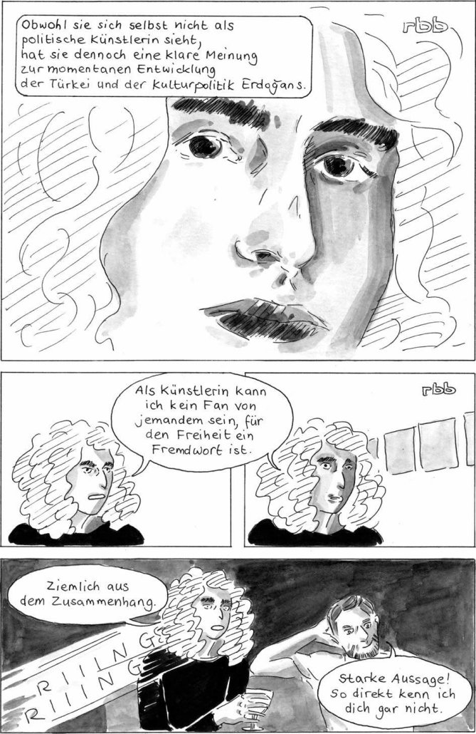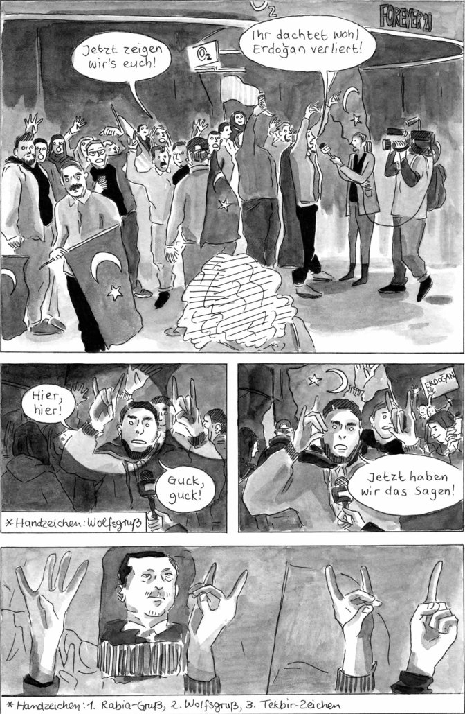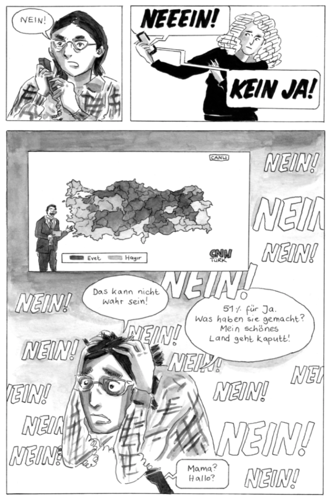 Büke Schwarz’ Comicerzählung beleuchtet zum einen die Deutsch-Türken und ihren Umgang mit der Veränderung ihrer Heimat und wie stark die Zensurverschärfungen Erdogans und seine Politik Einfluss auf sie hierzulande haben.
