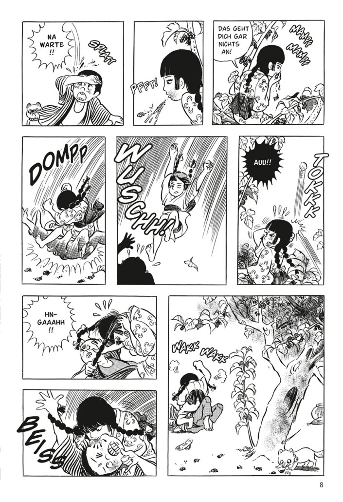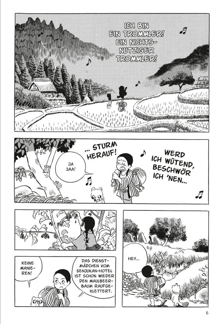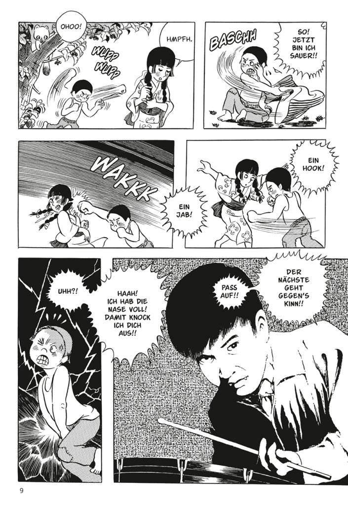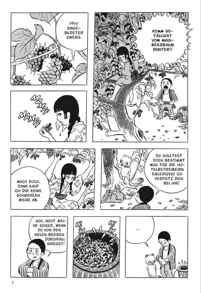 Susumu Katsumata stellt seine zarten und ausdrucksstarken Zeichnungen in den Dienst dieser grausamen, komischen und tief bewegenden Geschichten. Wie in einem Theaterstück präsentiert er Szenen aus dem bäuerlichen Leben in Tohoku, einer Bergregion im Nordosten des Landes, die auf seinen Kindheitserinnerungen basieren und ein Japan beschreiben, das von den Traditionen der Vorfahren bestimmt wird.