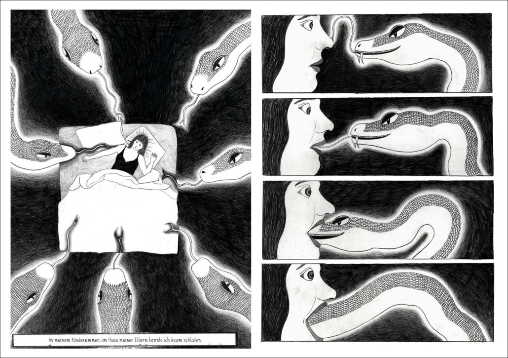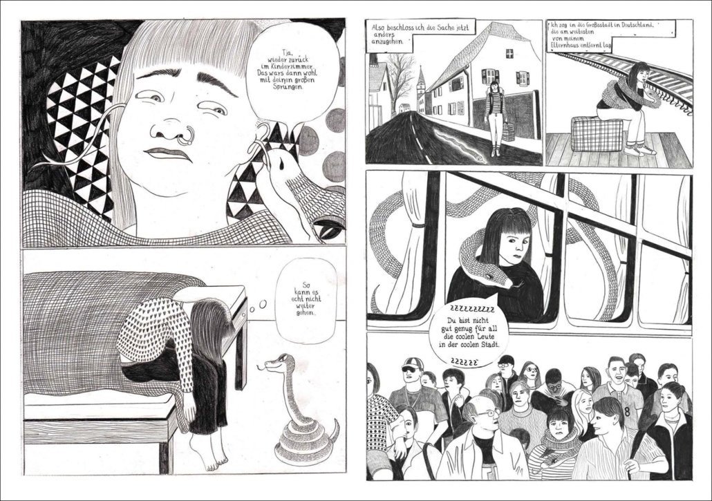 In dieser autofiktionalen Graphic Novel erzählt sie ihre Geschichte und die Geschichte ihrer Familie. Sie erzählt in klaren, kraftvollen, eindrücklichen Bildern von erstaunlich ästhetischer Vielfalt über die bäuerliche Herkunft der Großeltern, vom westlichen Arbeitermilieu der Eltern, über das Aufwachsen in Unbildung und Armut, über soziale Scham, den Gestank von Frittierfett, über ihre Billigklamotten mit albernen Aufnähern, ihre Entfremdung von ihren Ursprüngen und schließlich ihre Emanzipation als Künstlerin – und mit dabei ist immer die Schlange Selbstzweifel, die unabhängig von ihrem Erfolg bis heute nicht von ihrer Seite weichen will.
