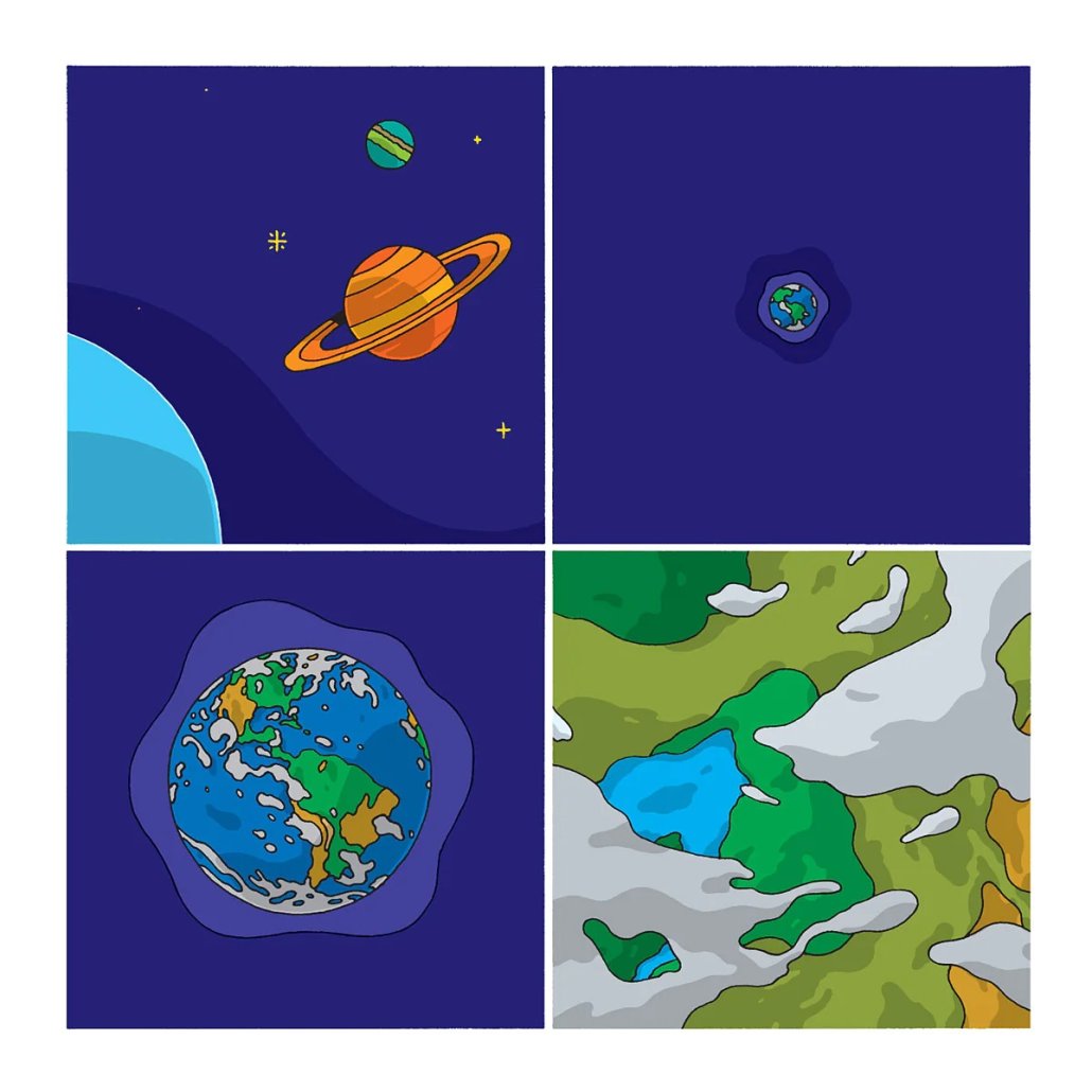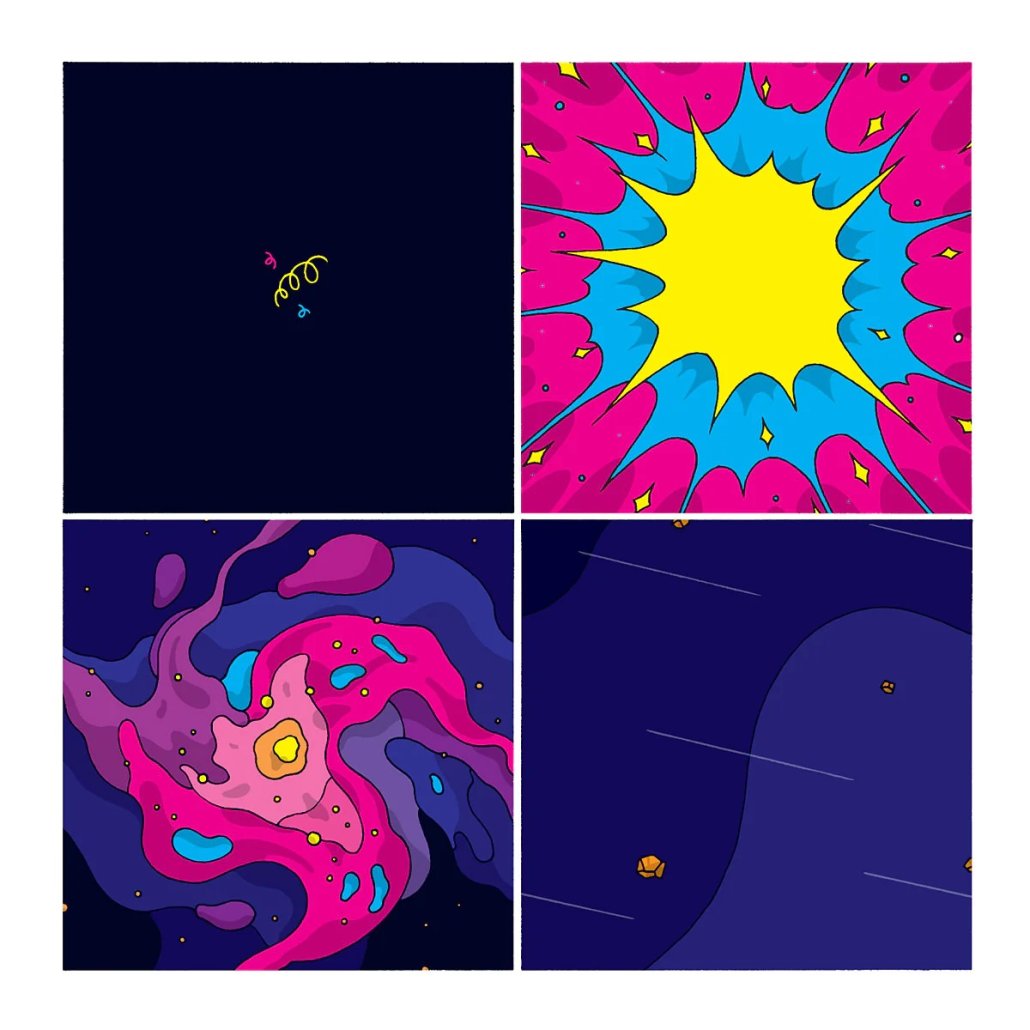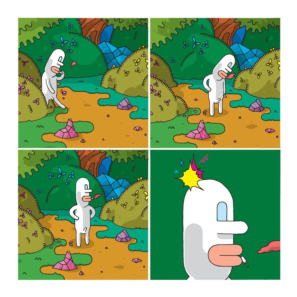 Samuel, der einsame Wanderer, begibt sich auf eine so psychedelische wie meditative Reise durch Zeit und Raum. Ein klarer Strich und leuchtende Farben laden ein, in Samuels überbordende Welt einzutauchen, in der Motive aus Weltgeschichte und Philosophie wild durcheinander zitiert werden…
