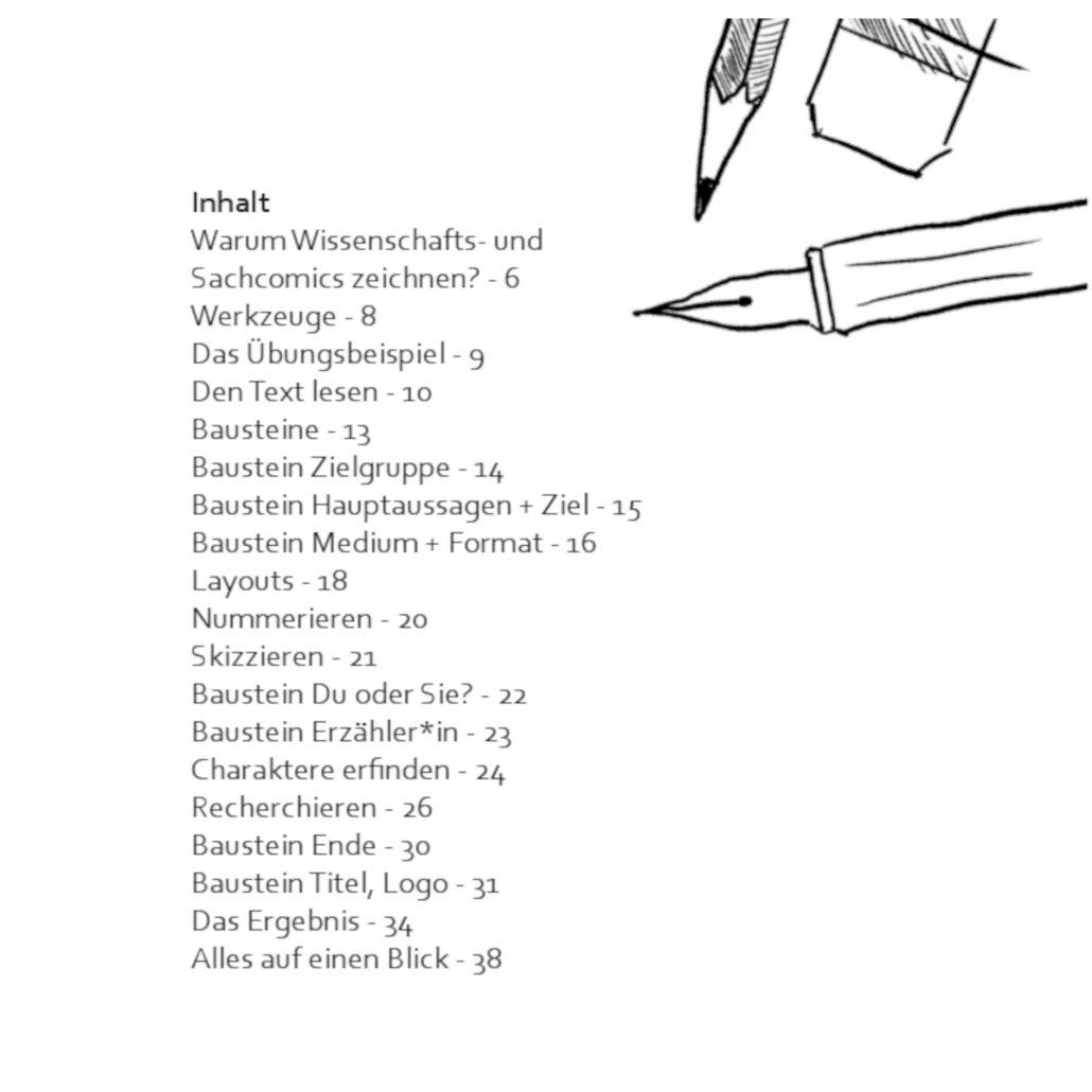 Sie dienen dazu, wissenschaftliche Sachverhalte auf einfache und manchmal unterhaltsame Weise zu vermitteln. Das Buch leitet Zeichner*innen Schritt für Schritt anhand eines Übungsbeispiels an, vom Text zur fertigen Zeichnung zu gelangen.