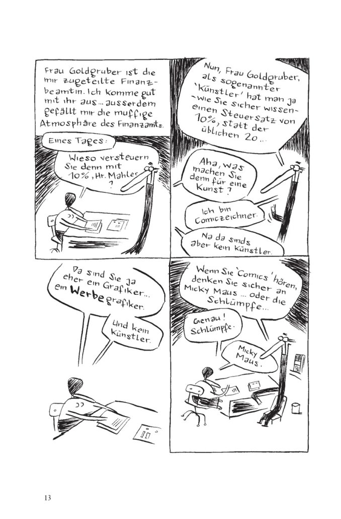 Angefangen bei den ersten Gehversuchen als Unterschriftenfälscher über eine kurze Karriere als Angestellter in einer Videothek bis hin zu Episoden aus seinem Leben als Comiczeichner: Mit dem distanzierten Blick fürs Absurde erzählt Nicolas Mahler in ‚Kunsttheorie versus Frau Goldgruber‘ aus seinem eigenen Leben. So bescheinigt ihm seine Finanzbeamtin Frau Goldgruber nach hartnäckiger Überzeugungsarbeit: ‚Na, das wird schon irgendwie ‘Kunst’ sein‘, und stuft ihn nicht als Werbegrafiker, sondern als ‚Künstler‘ ein. Immer wieder muss er sich für seine Tätigkeit als Comiczeichner rechtfertigen, sei es beim Zoll oder in akademischen Kreisen. An diesem Band werden Freunde des trockenen Wiener Humors nicht vorbeikommen: Nie war Mahler so lustig.