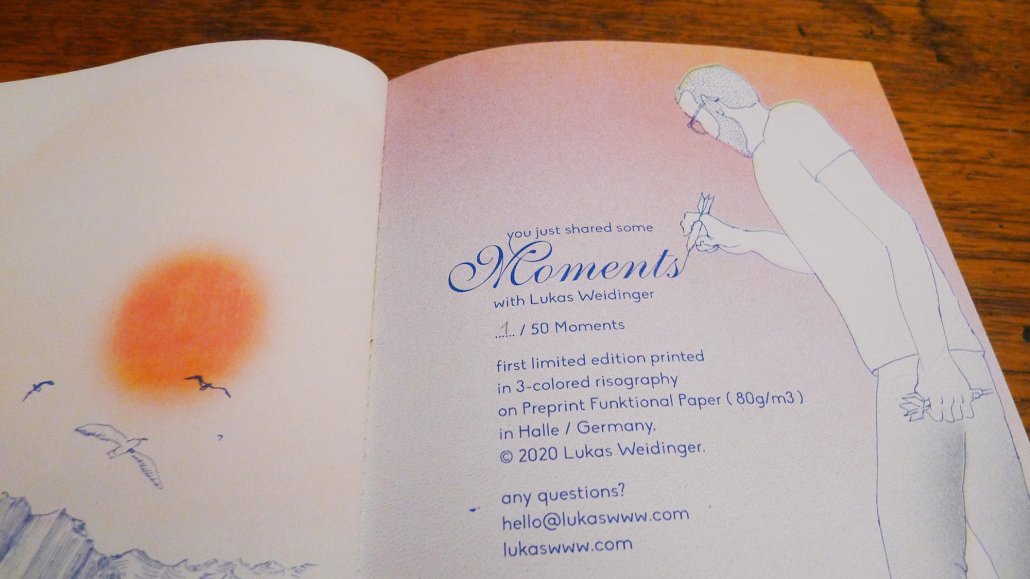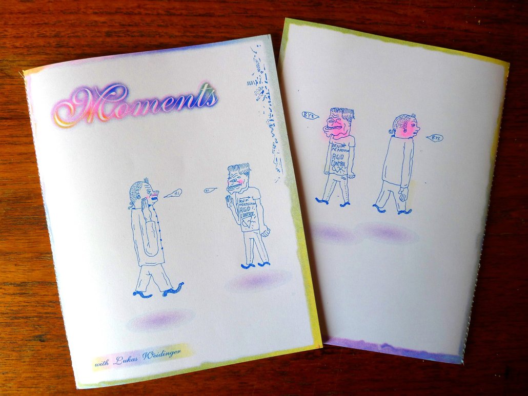 Eine Sammlung von Augenblicken aus den Büchern von Lukas Weidinger, inszeniert in 3 farbiger Risographie, von Hand gebunden in limitierter Auflage von 50 Stück (2. Auflage).