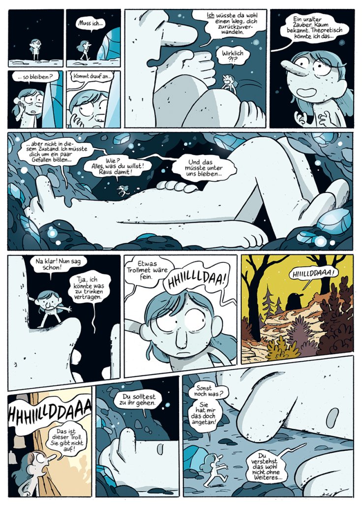 Was fu¨r ein Schreck: Hildas Mutter findet morgens ein Trollkind im Bett ihrer Tochter – während Hilda selbst in einem Trollkörper feststeckt. Und dann soll sie auch noch von einer Trollmutter aus den nahen Bergen adoptiert werden! Auf der Suche nach einem Weg zuru¨ck kommt Hilda dem geheimnisvollen Bergkönig auf die Spur. Ihre Mutter versucht indessen, den fanatischen Trolljägern zuvorzukommen, die nun auch hinter ihrer verwandelten Tochter her sind… Endlich gibt es die Auflösung des Cliffhangers aus dem letzten Band – und das Abenteuer geht ebenso spannend weiter!