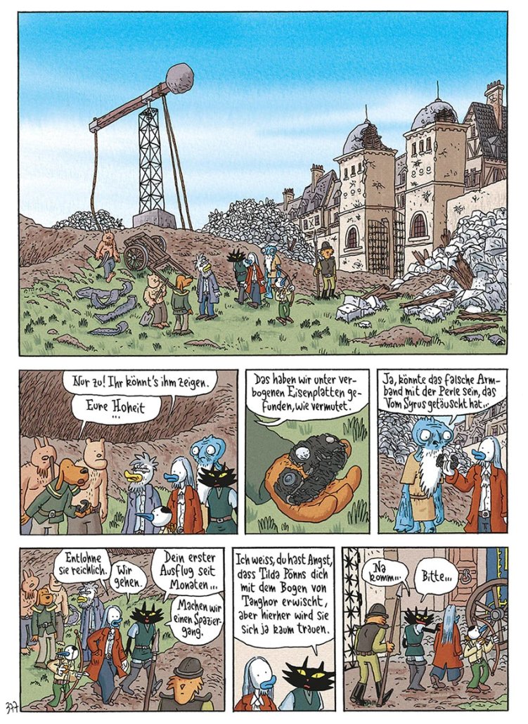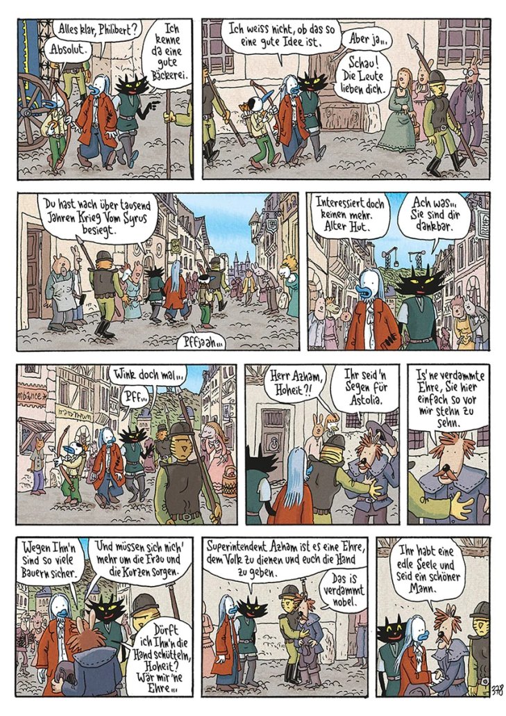 Ralph Azham steht am Scheideweg: Während sein Volk auf ihn zählt und erwartet, dass er den jungen Frieden schützt, der durch die atheistische Glaubensgemeinschaft von Tilda Pönns bedroht wird, wird Ralph bewusst, welchen Preis er für seine neue Stellung zahlen muss und wie schnell politische Macht die Mächtigen korrumpieren kann. Soll er als regent von Astolia lieber wieder abdanken…?§Lewis Trondheim (DONJON) liebt es, Genrekonventionen zu brechen. Seine Saga RALPH AZHAM spielt humorvoll mit den Versatzstücken der klassischen Fantasy-Unterhaltung.