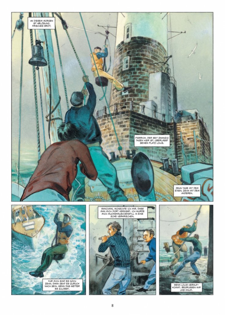 Weit vor der bretonischen Küste auf der Île de Sein trotzt Ar Men (»der Felsen«) Sturm und Wellen, ein Leuchtturm gebaut an einem der unwirtlichsten Orte Frankreichs. Die Männer, die dort ihren einsamen Dienst tun, nennen ihn auch »die Hölle der Höllen«, denn aufgrund seiner isolierten Lage ist mitunter wochenlang kein Kontakt zum Festland möglich — auch keine Evakuierung im Ernstfall. Dies ist die Geschichte von Germain, der in den 1960er Jahren das Leben an Land hinter sich ließ, um die Wunden, die seine Seele trug, zu überwinden. Im Ar Men hat er seinen Platz gefunden.