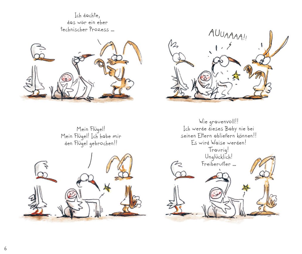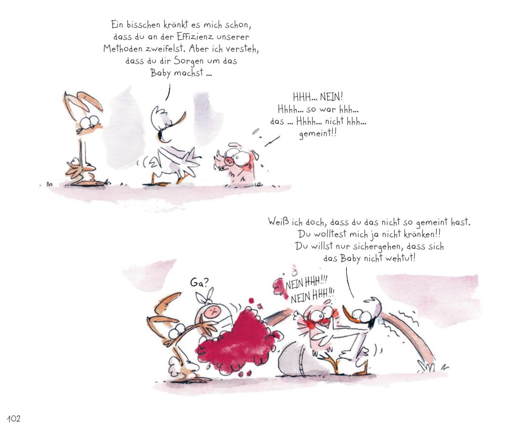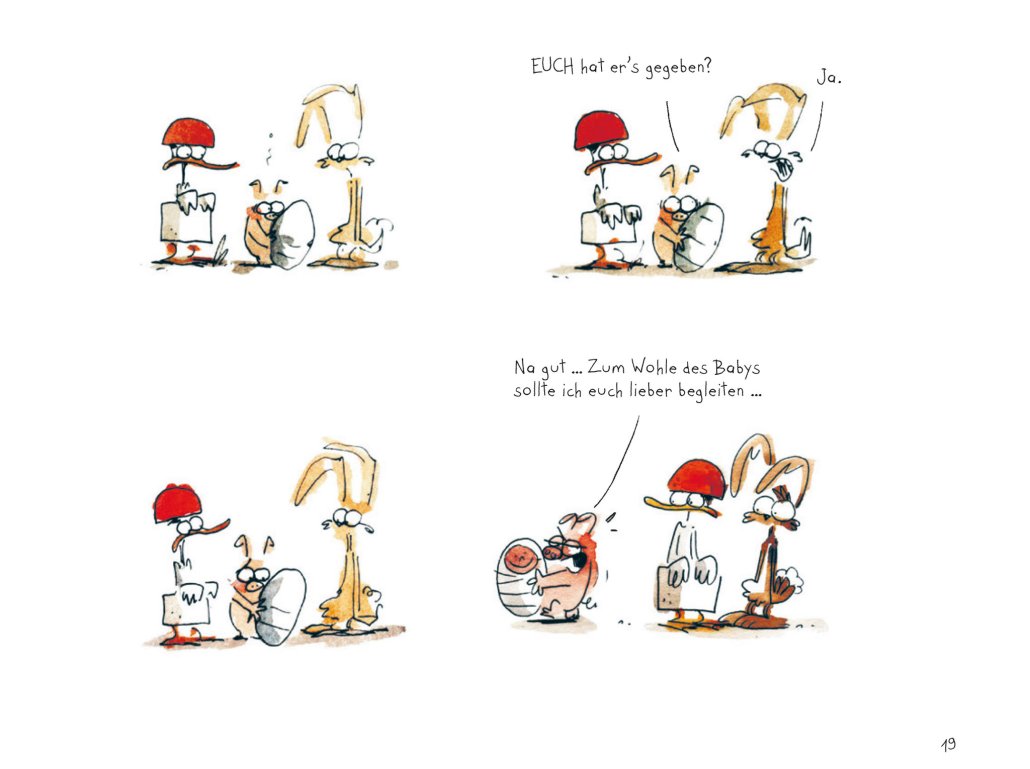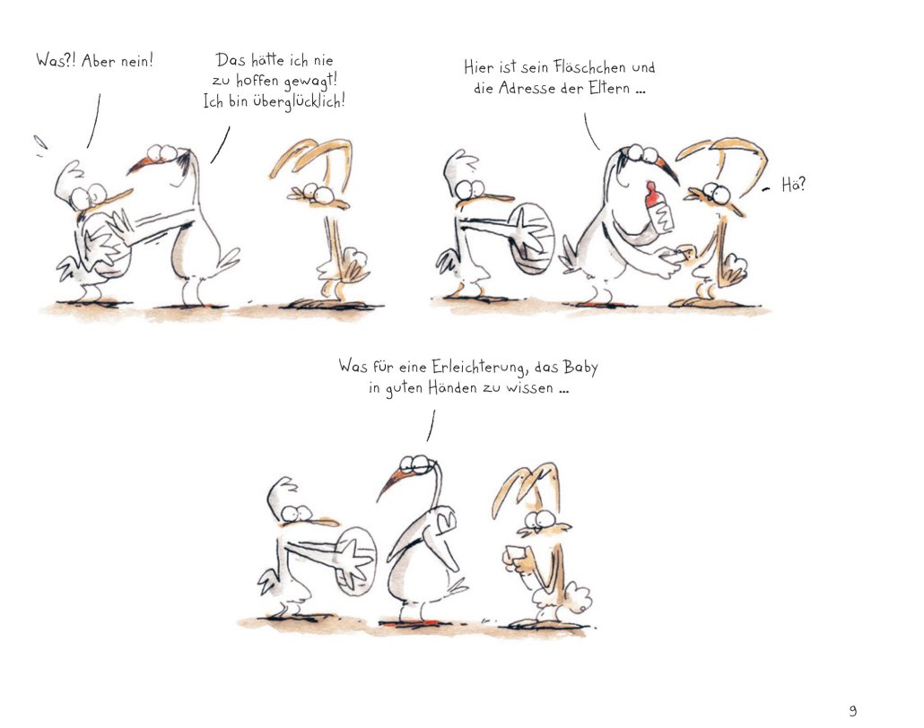 Als sich der Storch einen Flügel bricht, bleibt ihm nichts anderes übrig, als sein zappelndes Bündel Aushilfskräften anzuvertrauen: Ein unbedarftes Karnickel und eine hilflose Ente sollen die Zustellung zu Ende bringen. Auf dem Weg schließt sich ihnen ein kleines, dickes Schweinchen an – das Trio ist komplett! Nicht nur dass sie von Babys keine Ahnung haben, sie sind auch sonst nicht die hellsten Kerzen auf der Torte.