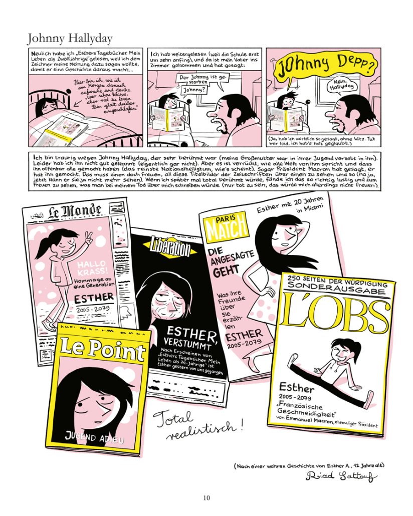 Auf 52 Seiten und in ebenso vielen Episoden erzählt Esther von dem, was sie als Dreizehnjährige im Laufe des Jahres erlebt und beschäftigt. Was sie ihren Eltern nicht erzählt, davon berichtet sie in diesem Tagebuch. Abwechselnd lustig und bewegend, zärtlich und grausam: Esthers Alltag wird zu einem Porträt der Jugend von heute und zu einem Spiegel unserer Gesellschaft.