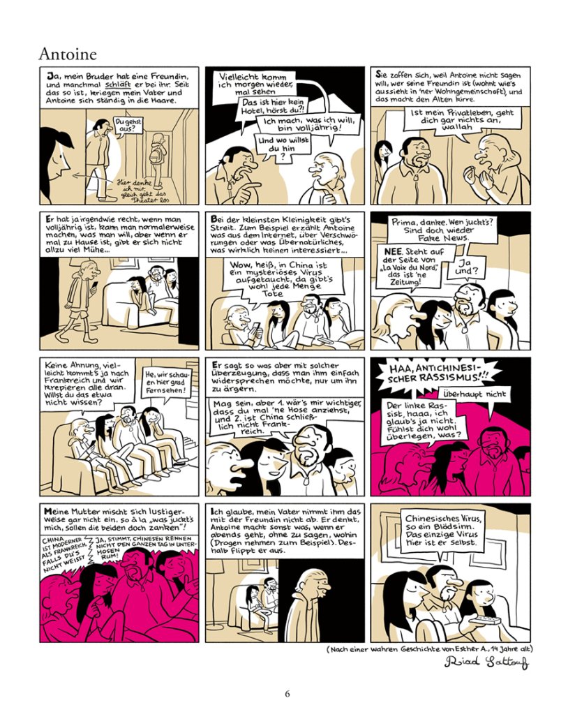 Dann wird alles auf den Kopf gestellt, als das Coronavirus auftaucht… Zwischen Homeschooling, ihrem Vater, den der Mangel an Masken und Desinfektionsmittel in den Wahnsinn treibt, ihrer Mutter im Homeoffice und ihrem Bruder, dem alten Verschwörungstheoretiker, fühlt sich Esther wie im Gefängnis. Doch voller Optimismus stellt sie sich einfach ihre ‚Welt danach‘ vor.