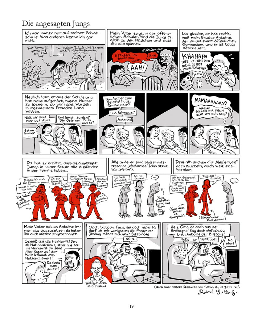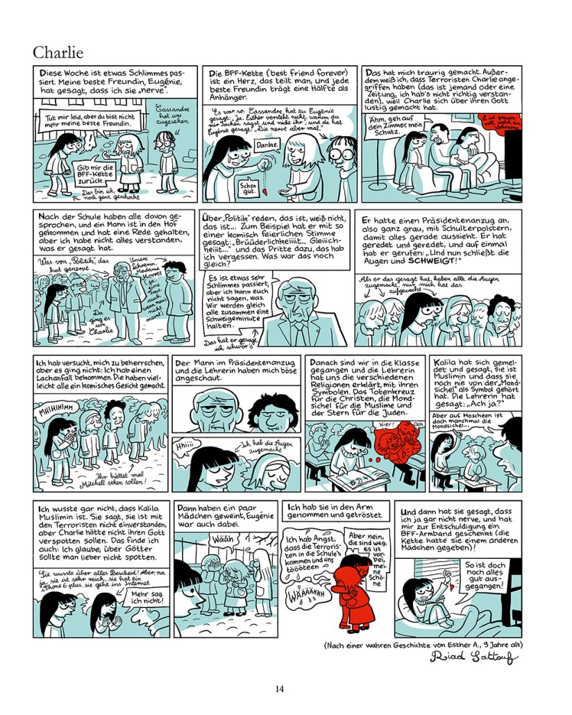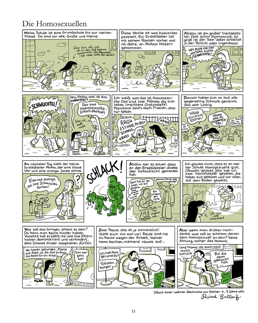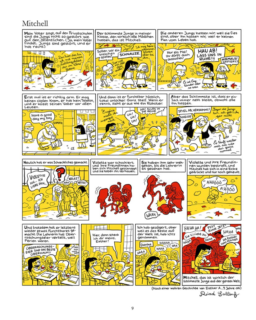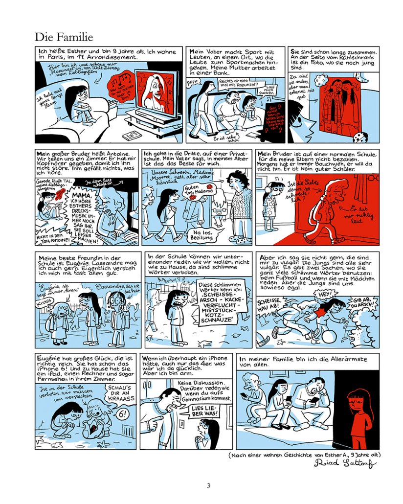 Darf man sich über den Gott anderer leuten lustig machen? Warum ist Schönheit das A und O? Wird nach Charlie Hebdo nun auch die eigene Grundschule überfallen? Und wieso hat jeder ein iPhone, nur man selbst nicht (nicht mal ein iPhone 4!)? Die zehnjährige Esther hat es nicht immer leicht. Sie schwärmt für ihren Vater und für Popstars (nicht aber für ihren großen Bruder!) – und es gibt sie wirklich: regelmäßig vertraut die Tochter eines Pariser Freundes Riad Sattouf ihre Erlebnisse, Gedanken und Wunschträume an. Lustig, berührend und zuweilen schmerzhaft.