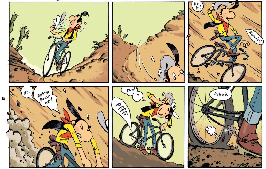 Auf einem seiner Ausflüge durch die Prärie landet Lucky Luke ganz unvermittelt in einem Sattel, der ihm fremder nicht sein könnte: im Sattel eines Drahtesels nämlich – in dem er dann gleich auch noch den nordamerikanischen Kontinent durchqueren muss. Klar, dass das seinem eigentlichen Sattelträger Jolly Jumper gar nicht in den Kram passt.