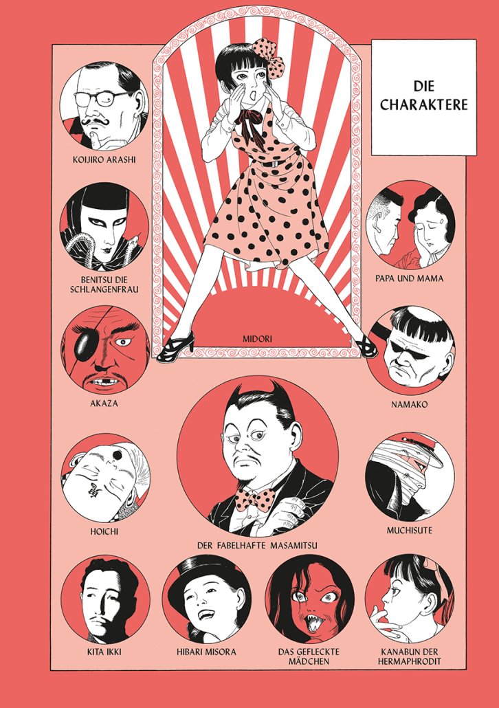 In eindrucksvollen Bildern erzählt Suehiro Maruo die Geschichte von Midori, die mit einer Freak Show durch die Lande zieht. Im Kreise seltsam deformierter Gestalten fühlt sie sich fremd und bedroht – unbedingt will sie dieser Hölle entkommen. Als sich der kleinwüchsige Schlangenmensch Masamitsu der Truppe anschließt, projiziert sie ihre Hoffnungen auf ihn, bis eine tragische Schicksalswendung all ihre Träume zerstört.