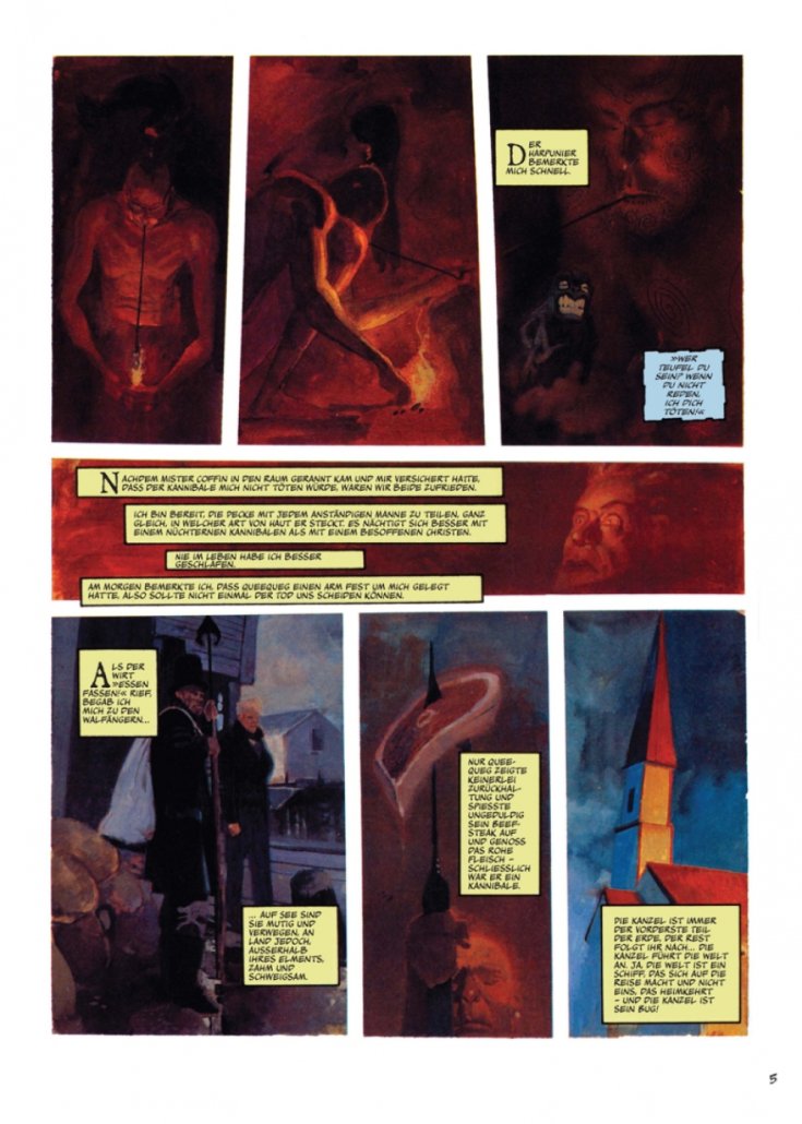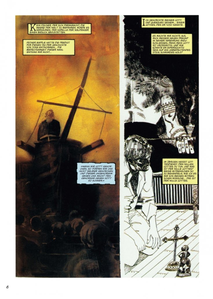 Mit seiner Fassung von Melvilles Meisterwerk »Moby Dick« beweist der legendäre Zeichner Bill Sienkiewicz seinerseits eine unerreichte Meisterschaft der Neunten Kunst. Scheinbar spielerisch oszilliert er zwischen Karikatur und Realismus, zwischen Montagetechnik und Schraffur und verleiht seiner Reduktion des literarischen Stoffes einen unwiderstehlichen Sog.