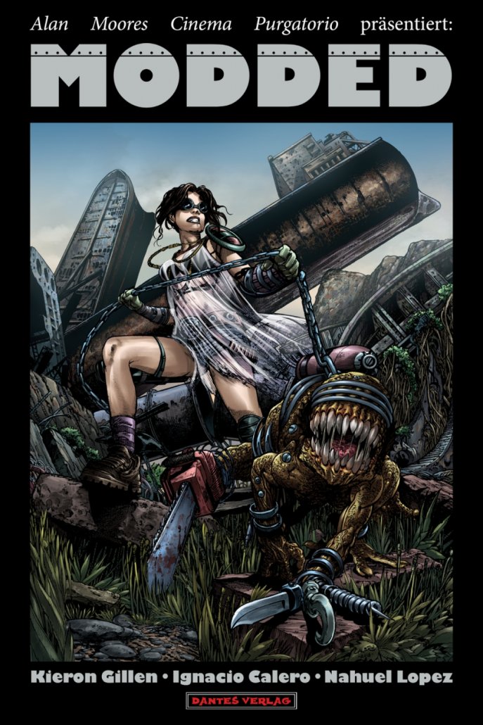 Modded (auf Deutsch: ‚modifiziert‘), wendet sich an die Freundinnen und Freunde früher Adventure-Games und gepflegten Kino-Humors. Kieron Gillen (Uncanny X-Men, Iron Man), Ignacio Calero (Belladonna, Stormwatch) und Nahuel Lopez (Mercury Heat, Crossed: Badlands) erzählen uns von der kleinen Fringe (‚Franse‘) im ‚Schnapp’ sie dir alle‘-Land, dem nach irgendeiner Apokalypse inzwischen trockengefallenen Atlantik. Moment mal: ‚Schnapp’ sie dir alle‘? Eigentlich will Fringe nur ihren Fluffbumble (‚Fusselwusel‘ … oder auch: ‚alles vermasselnder Wichtigtuer‘) wiederhaben, den ihr der Dämonensammler Tommy Zero (‚Thomas Null‘) abgenommen hat. Böse, das! Zum Glück trifft Fringe auf Bloody Susan (‚die blutige Susanne‘) und deren Dämon Mister Boom (‚Herr Explosionsgeräusch‘), die sich anbieten, ihr bei Suche und Wiederbeschaffung behilflich zu sein. Modded ist ein Roadmovie ohne Road, voller abgedrehter Einfälle und mit grandiosem Creature- und Charakterdesign.