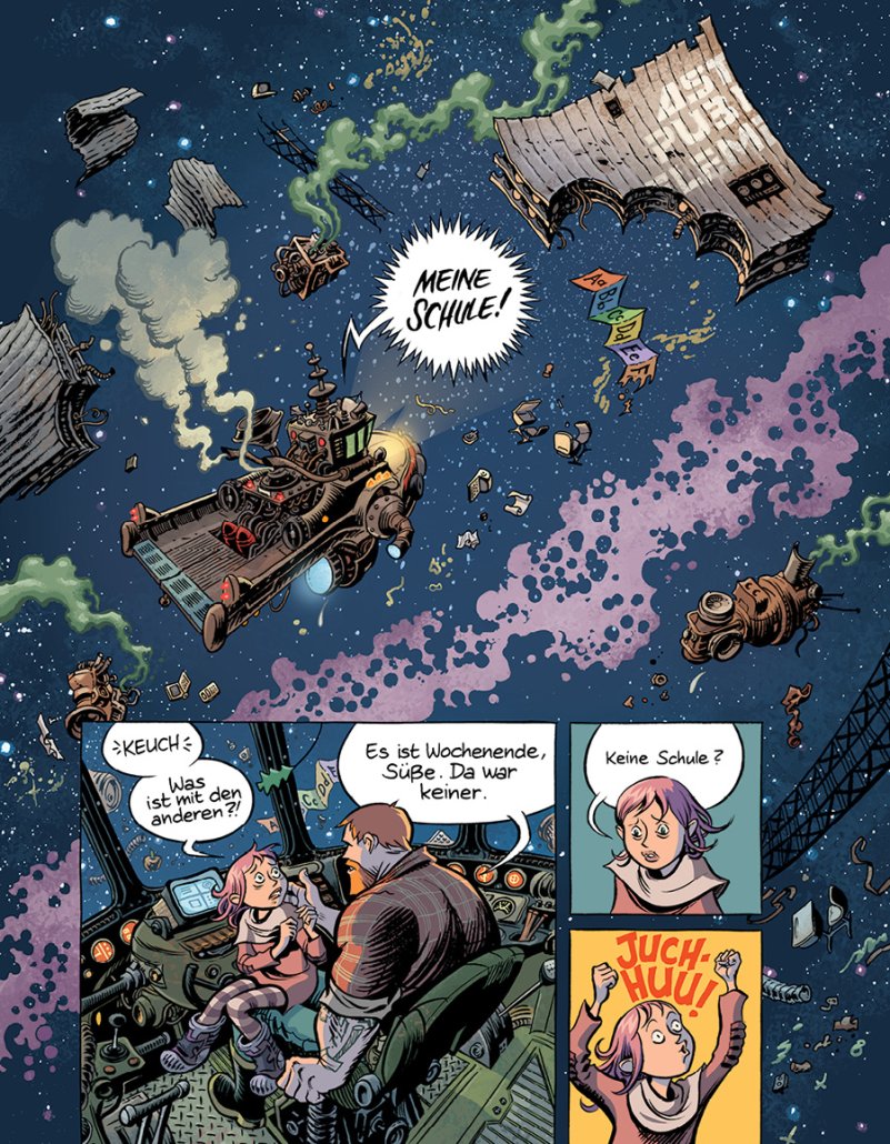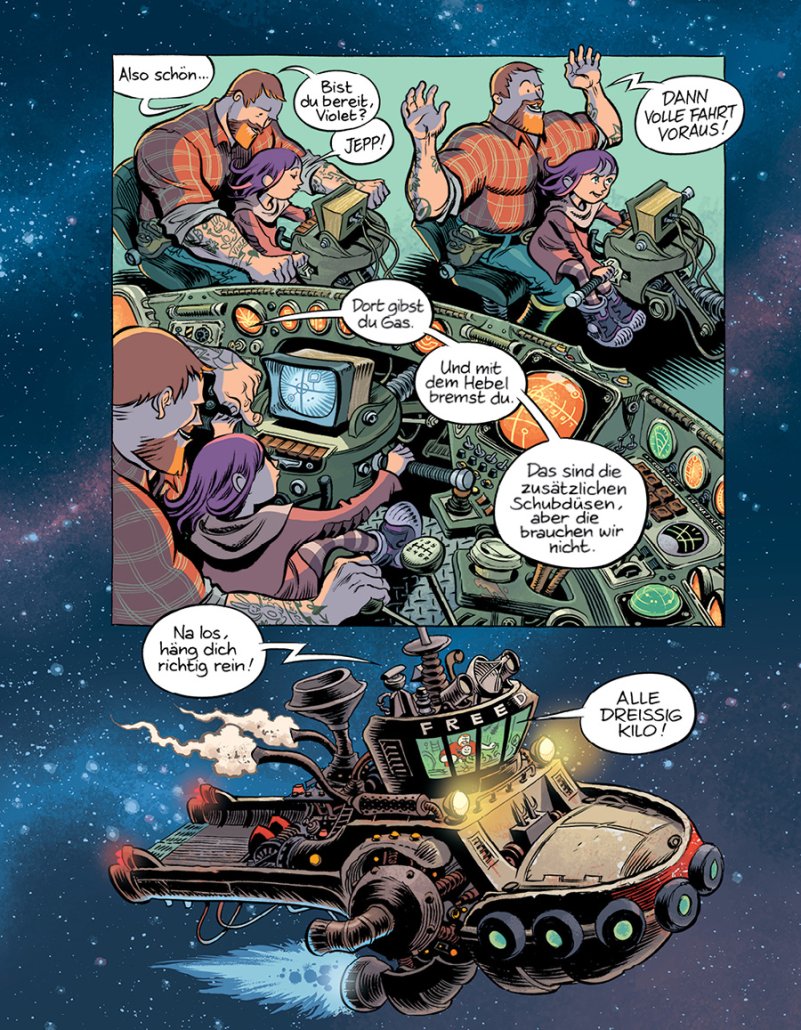 Für Violet ist ihre Familie das Größte in der ganzen Galaxis. Als ihr Vater eines Tages einen hochriskanten Auftrag übernimmt und dabei spurlos verschwindet, kann Violet also nicht tatenlos abwarten und Nägel kauen! Sie bricht auf eigene Faust auf, um ihn zu suchen – an ihrer Seite die schrulligen Freunde Elliot und Zachäus. Doch die Weiten des Weltalls sind unermesslich und voller Gefahren, und Violet muss schnell feststellen, dass ihr Vater in GROSSEN Schwierigkeiten steckt…