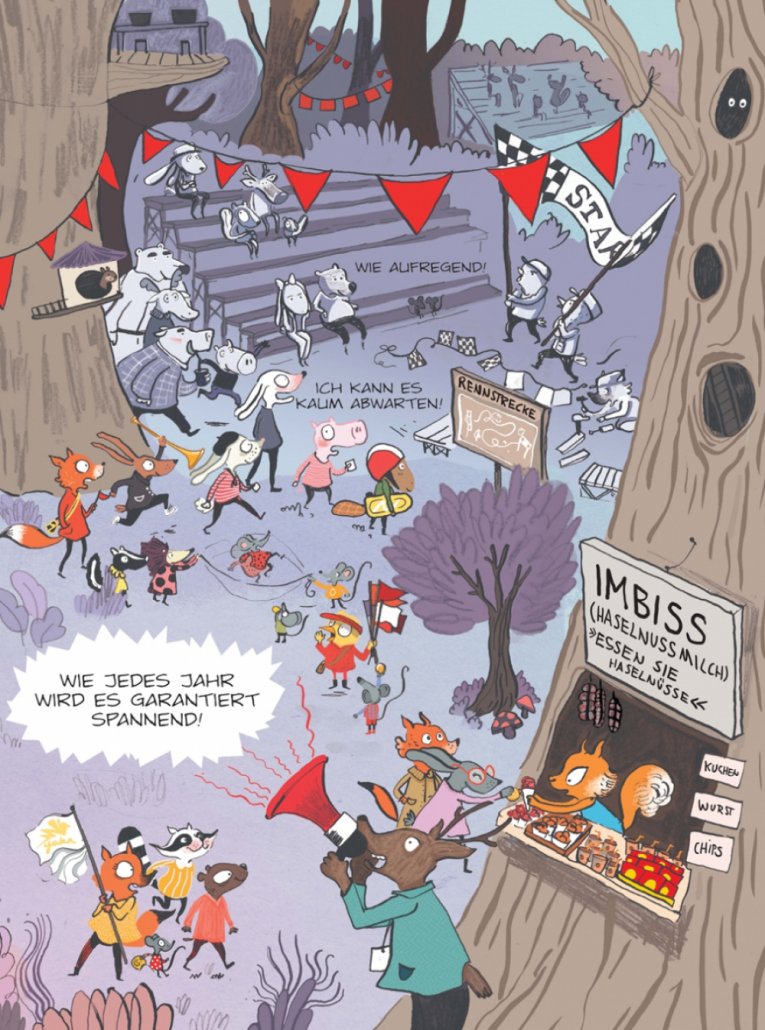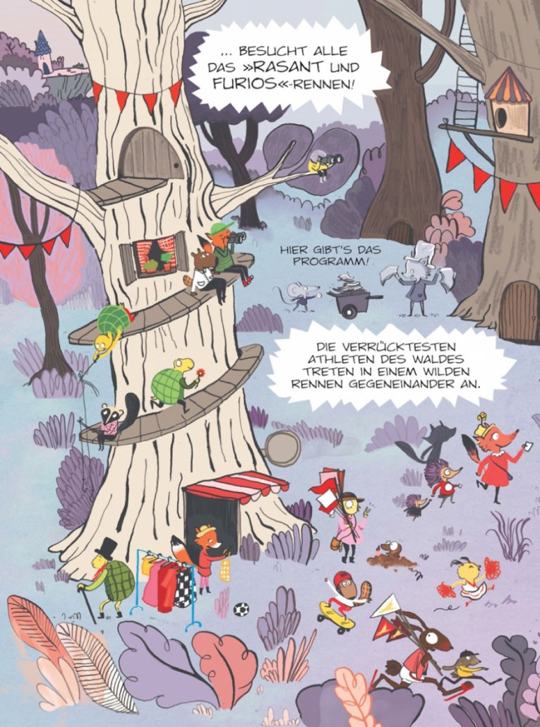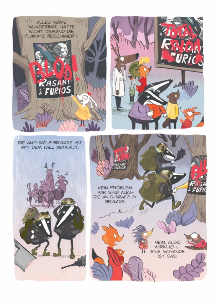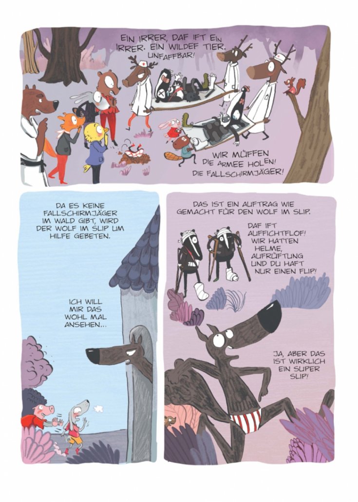 Der Wald ist in Aufruhr: Bald beginnt das jährliche »Rasant & Furios«-Rennen! Doch irgendjemand scheint die allgemeine Vorfreude nicht zu teilen. Alle Poster für das Rennen wurden zerstört! Die Waldbewohner sind ratlos. Denn Rennen fahren, das ist richtig cool, oder? Der Wettbewerb, die Siegerkrönung, das ist doch klasse! Der Wolf im Slip untersucht den Vorfall, und dabei findet er heraus, dass die Person, die für den Schaden verantwortlich ist, nicht das wilde Tier ist, für das wir sie halten.