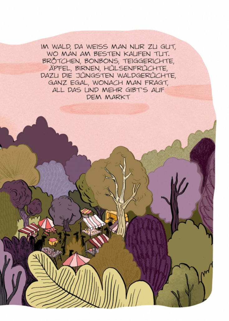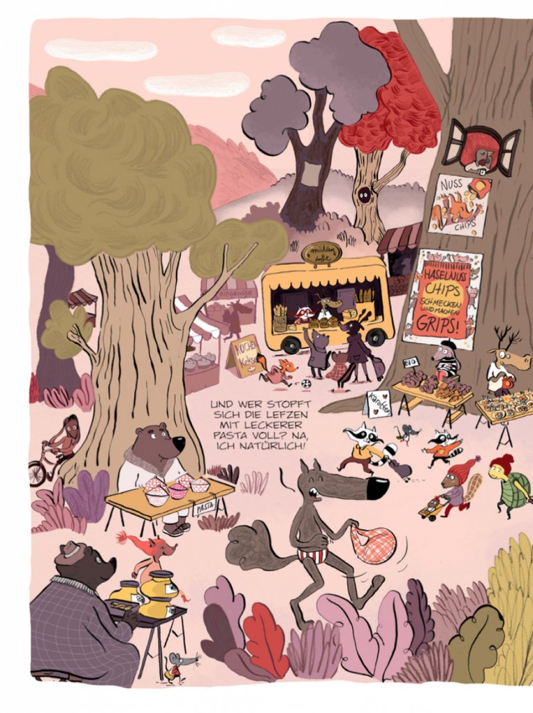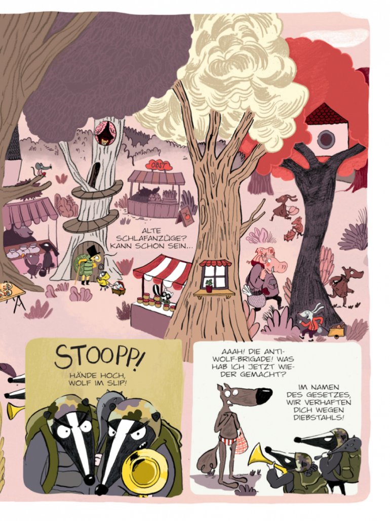 Auch im Wald gibt es Regeln: Um zu kaufen, braucht man Geld, und um Geld zu haben, muss man arbeiten. Aber wenn das so ist, woher hat dann der Wolf das Geld zum Einkaufen? Er hat immerhin drei Münzen, dabei tut tut er ja gar nix… Er muss ein Dieb und Faulenzer sein! Ab ins Gefängnis mit ihm! Jetzt muss die Anti-Wolf-Brigade nur noch herausfinden, woher das Geld stammt – denn im Gegensatz zum Wolf sind sie schließlich fleißig!