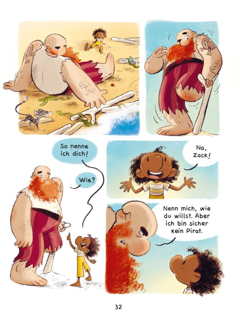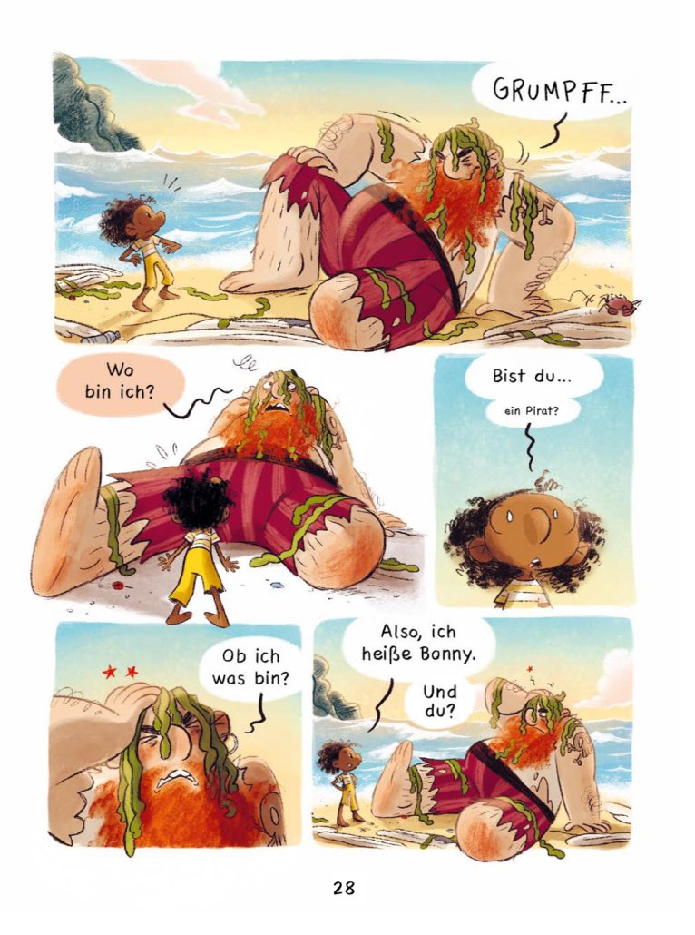 ‚Bist du… ein Pirat?‘ Der Mann, den Bonny laut schnarchend am Strand entdeckt, erinnert sich an nichts, nicht einmal an seinen Namen. Mit seinem struppigen Bart und dem einen Bein, soviel ist Bonny klar, muss er einfach ein Pirat sein. Und als solcher braucht er einen Namen und eine Crew! Ehe Bonnys Pirat sich’s versieht, heißt er Zack und die beiden stechen gemeinsam in See. Doch als sie den Kurs eines echten Piratenschiffs kreuzen, fallen sie Zacks altem Widersacher Augenklappenklaus in die Hände, der nichts und niemanden zu fürchten scheint – höchstens seinen Papagei. Beim Klabauterkind! Bonny ist fuchsteufelswild entschlossen, dafür zu sorgen, dass ihr Freund Zack nicht bis ans Ende seiner Tage in der Kombüse Kartoffeln schälen muss.