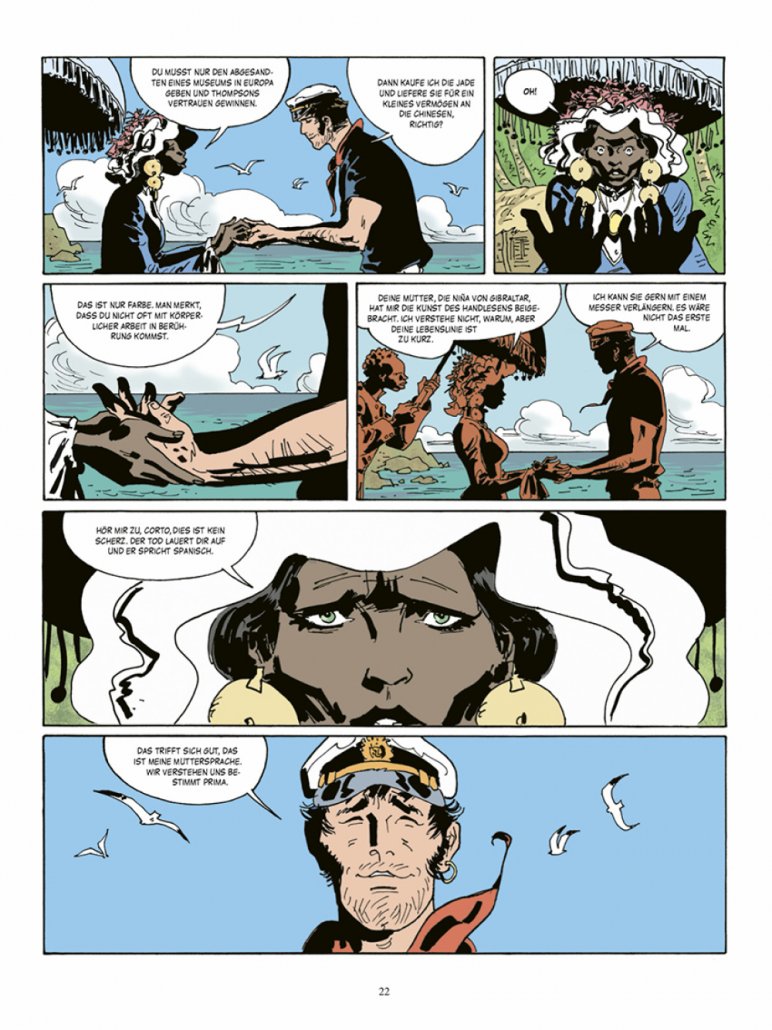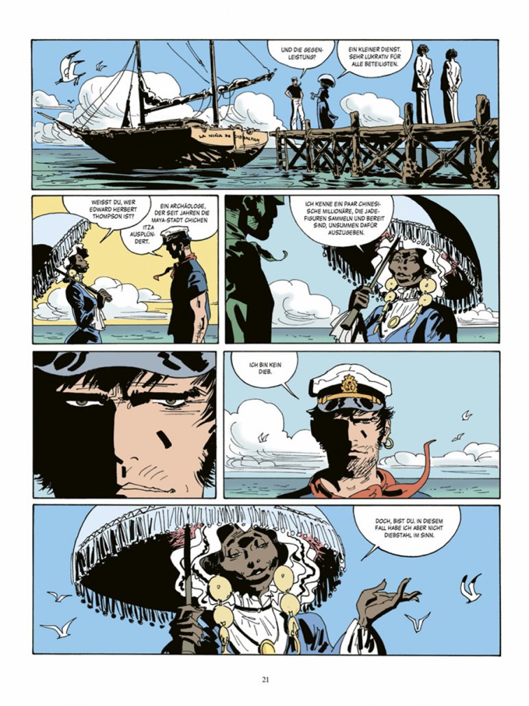 Golden Rosemouth teilt Corto Maltese mit, dass seine Lebenslinie verkürzt ist, dass der Tod auf ihn wartet und dass dieser Spanisch spricht. ‚Das trifft sich gut, ich auch‘, sagt Corto dazu. Er soll eine unschätzbare Sammlung von Jade-Kunstwerken an sich bringen und gerät in den sehr brutalen, sehr blutigen Mexikanischen Bürgerkrieg 1926 – 1929 mit den militanten Katholiken. In einer solchen Konstellation ist auch Rasputin nicht weit – jetzt in priesterlichem Gewand.