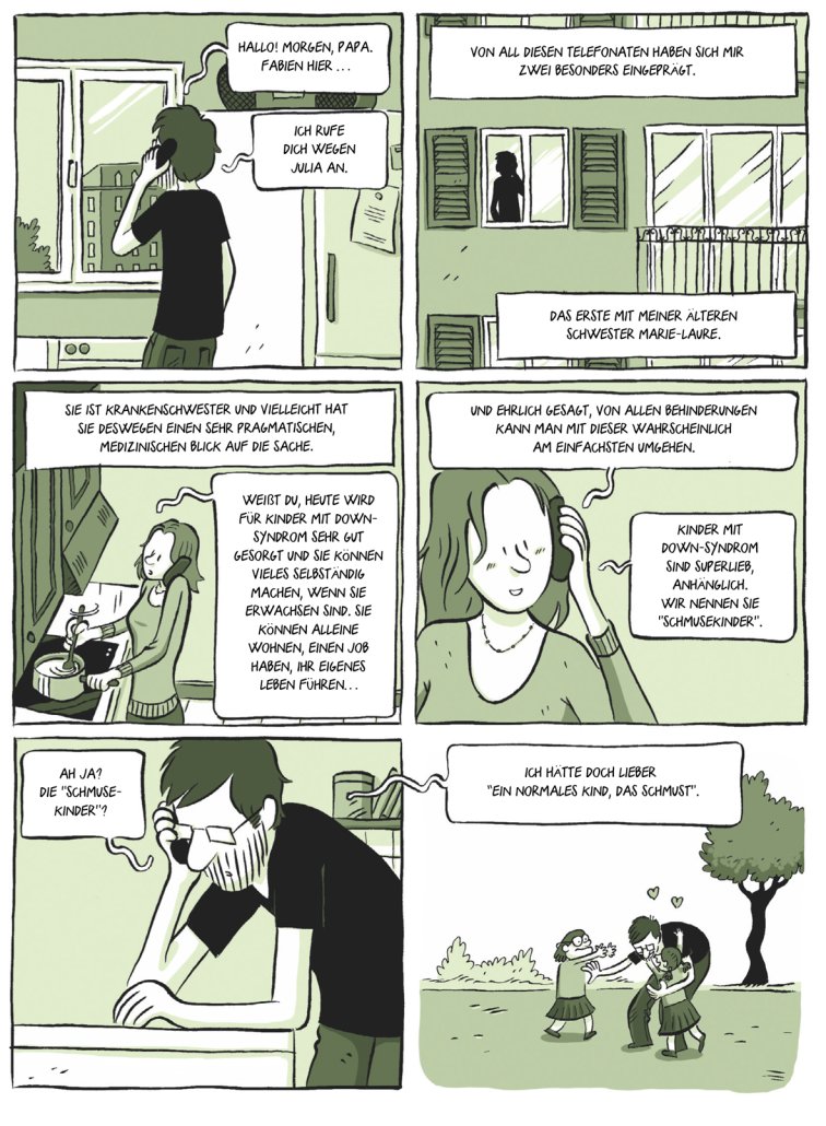 Dies ist die Geschichte einer Begegnung. Der Begegnung eines Vaters mit seiner Tochter, die nicht ganz so ist wie andere Kinder …§Als nach der Geburt seiner zweiten Tochter Julia der Gendefekt Trisomie 21 und ein damit einhergehender Herzfehler festgestellt werden,§bricht für den jungen Vater Fabien zunächst eine Welt zusammen. Wie soll man damit umgehen, dass das eigene Kind behindert ist? Kann man es lieben lernen? Und wenn nicht, was ist man dann für ein Mensch? §§Zwischen Schmerz, Zweifeln, Augenblicken der Trauer, aber auch des unerwarteten Glücks berichtet Fabien Toulmé von dem schwierigen Weg der Akzeptanz, der ihn zu seiner Tochter geführt hat. So berührend wie humorvoll und so einfühlsam wie aufrichtig erzählt der französische Autor und Zeichner von Liebe, Familie, Verantwortung und den kleinen Unterschieden, die das Leben ausmachen …