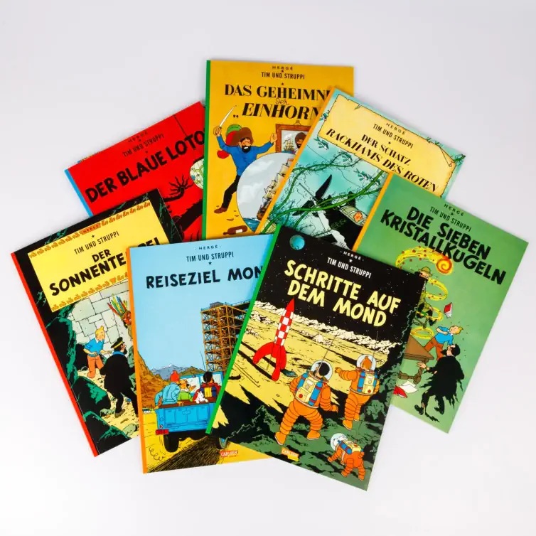 Enthalten sind die acht Alben Die Zigarren des Pharaos, Der Blaue Lotos, Das Geheimnis der Einhorn, Der Schatz Rackhams des Roten, Die sieben Kristallkugeln, Der Sonnentempel, Reiseziel Mond und Schritte auf dem Mond.