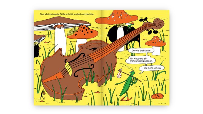 Eines Sommers stößt eine wandernde Grille im Wald auf eine alte Geige. ‚Wie praktisch!‘, ruft sie und zieht prompt in das geräumige Instrument ein. Nachts bespielt sie mit ihren Beinen die Saiten und erfreut damit alle Insekten und Mäuse in der Umgebung, sogar die Motten in der Kürbisbar. Doch als das Jahr zu Ende geht, steht ein bitterkalter Winter vor der Tür, der die Musik der Grille und den Zusammenhalt im Wald auf eine harte Probe stellen wird.