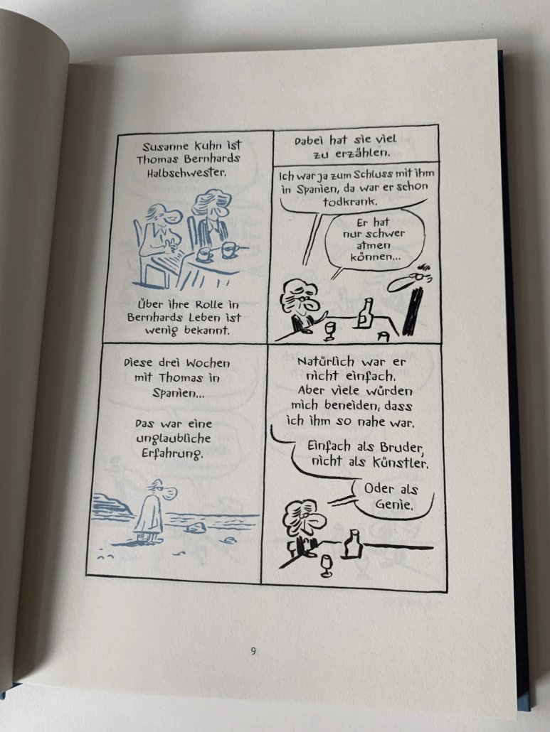Es ist zunächst eine bewegende Erinnerung an die letzte gemeinsame Zeit mit dem berühmten Halbbruder. Nach der turbulenten Uraufführung von ‚Heldenplatz‘ am Wiener Burgtheater reisten die beiden im November 1988, wenige Monate vor Bernhards Tod, an die Costa del Sol. Susanne Kuhns sensible Darstellung dieser drei Wochen wird durch die Visualisierung von Nicolas Mahler zu einem eindringlichen Bericht aus der letzten Lebensphase des Autors. Mahler, bekannt für seine Graphic Novels nach Werken der Weltliteratur (u.a. von Thomas Bernhard, Robert Musil und Franz Kafka), versteht es, in seinen minimalistischen Zeichnungen die Essenz der geschilderten Momente einzufangen.