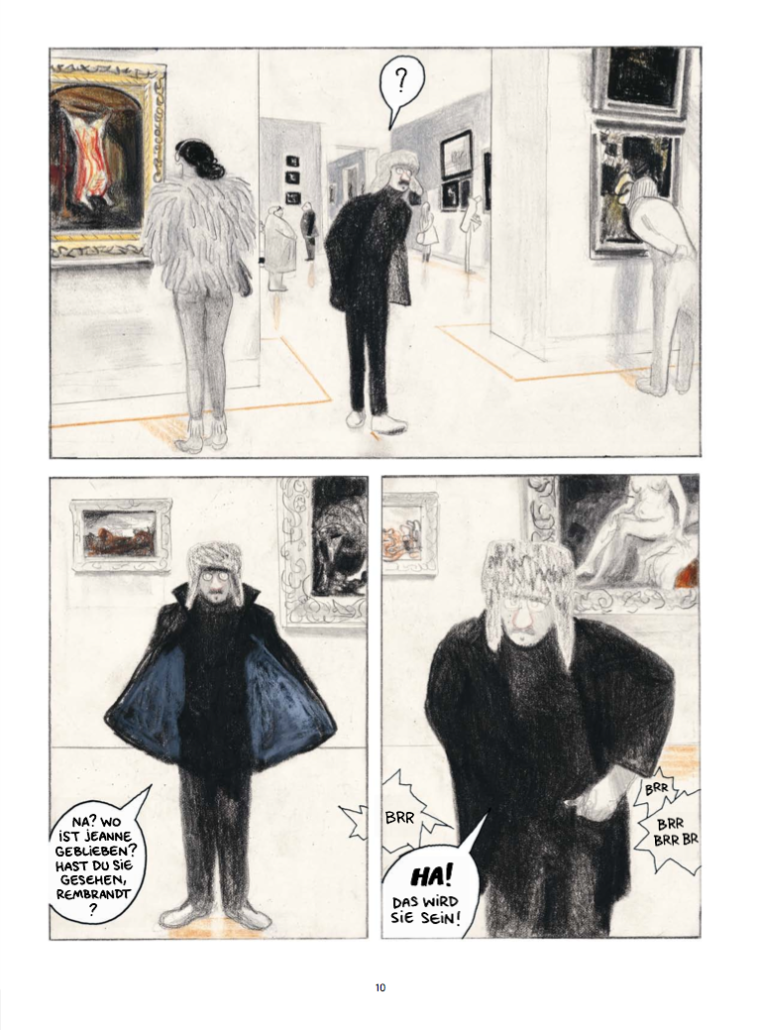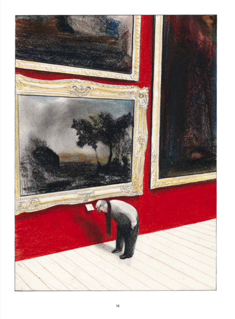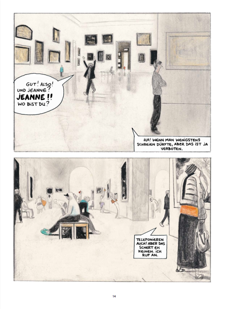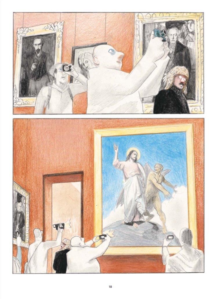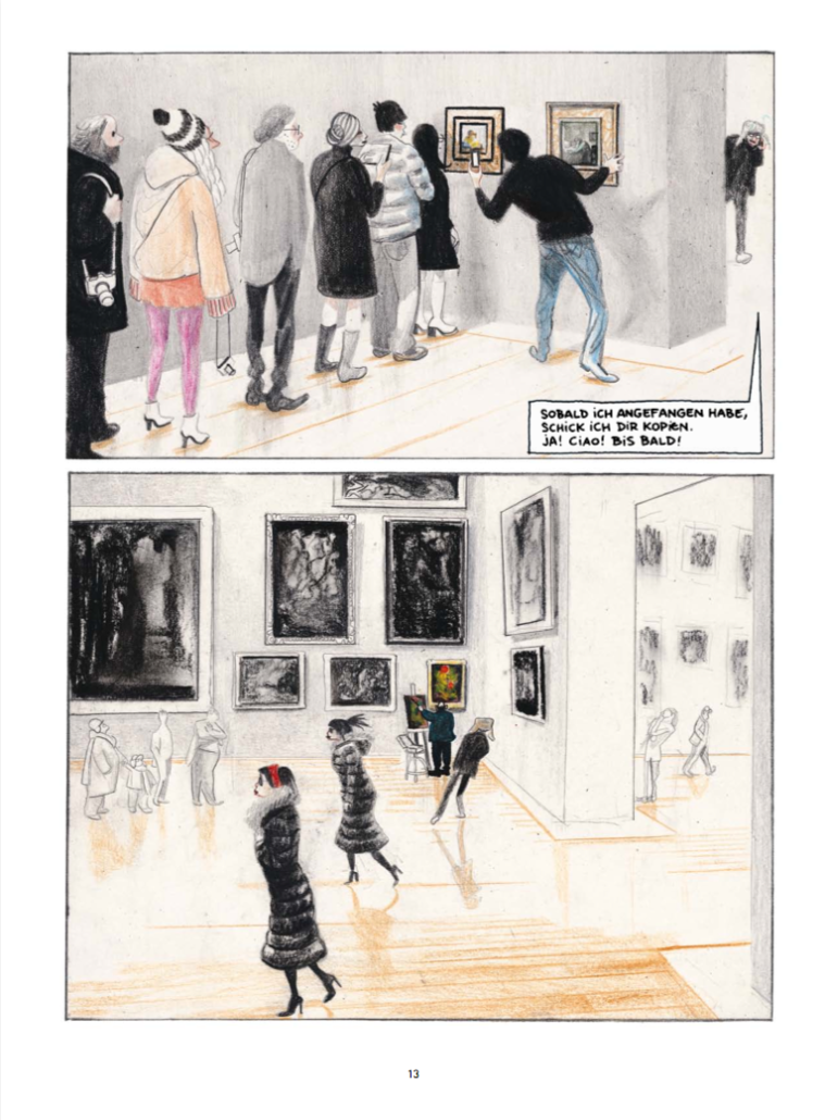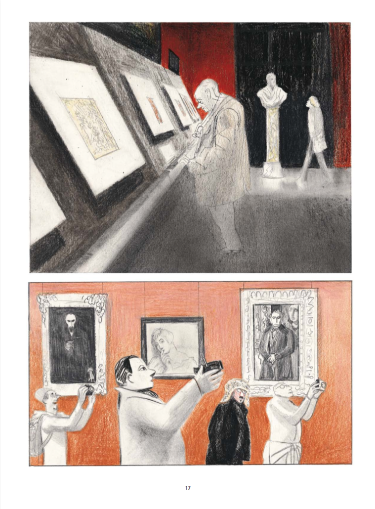 Der französische Comicautor David Prudhomme lädt zu einem ungewöhnlichen Streifzug durch den Pariser Louvre ein, bei dem er spielerisch die Rollen vertauscht und fragt: Wen betrachtet eigentlich die Mona Lisa? In seiner Hommage an das Museum erscheinen die Kunstwerke in ihrer stillen Zeugenschaft als Betrachter und die Besucher aus aller Welt als die wahre Attraktion. §§Die Schülergruppe, die unfreiwillig die Schiffbrüchigen von Théodor Géricaults Gemälde „Das Floß der Medusa“ nachstellt; die Reiseleiterin, die ihre Schäfchen führt wie Eugène Delacroix´ Freiheit das Volk; der Lesende vor der Skulptur des altägyptischen „Sitzenden Schreibers“: David Prudhomme fängt Momente von skurrilem Witz ein und lässt in raffinierten Buntstiftzeichnungen die Bild- und Realitätsebenen verschwimmen.