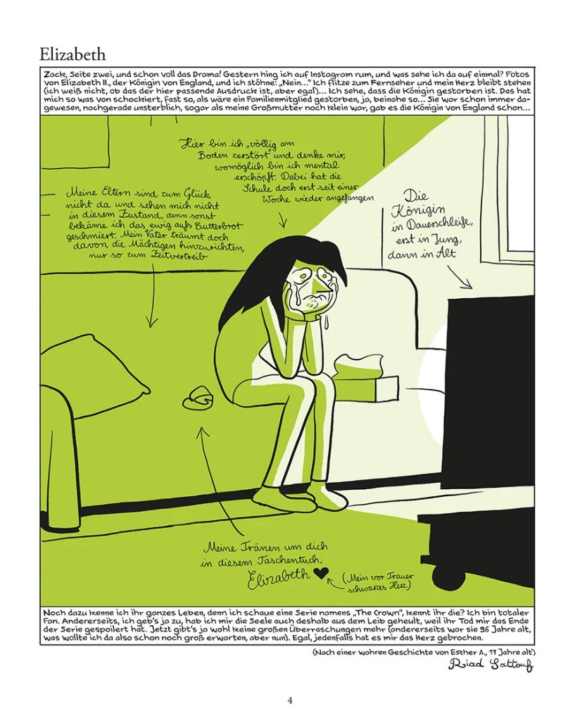 Esther könnte verrückt werden angesichts all der unterkomplexen Idioten, deren Mist sie sich ständig anhören muss! Die Attentate verharmlosen, ihr »Unterwerfung unter den islamistisch beeinflussten Neopuritantismus« unterstellen und, und, und… Ist das etwa das Erwachsenenleben?! Dann bandelt ihre beste Freundin auch noch mit der amtierenden Tussi-Nobelpreisträgerin an (geht’s noch?), Elisabeth II. stirbt (die war doch schon Königin, als ihre Oma noch ein Mädchen war) und, ach Gott, die Abiprüfungen! Und dieses ganze Leben, das Esther danach noch leben muss… am Ende gar als Single?!