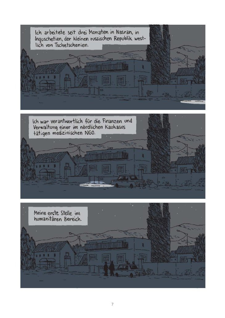 1997 wird Christophe André, Mitarbeiter der hilfsorganisation Ärzte ohne Grenzen, im Nordkaukasus von tschetschenischen Separatisten entführt. Guy Delisle hat Christophe André einige jahre später getroffen und die Geschichte seiner Geiselhaft aufgezeichnet: 111 Tage Warten, ohne jedes Wissen um das, was draußen passiert, ob man ihn für tot hält oder um seine Rettung bemüht ist. §§Guy Delisle, Autor so erfolgreicher Reportagecomics wie „Aufzeichnugen aus Jerusalem“, „Aufzeichnugen aus Birma“ und „Pjöngjang“ ist neben Joe Sacco zweifellos der bekannteste Comicdokumentarist. Zum ersten Mal nimmt er sich hier einer fremden Geschichte an und setzt sie sensibel und erschütternd zugleich um.