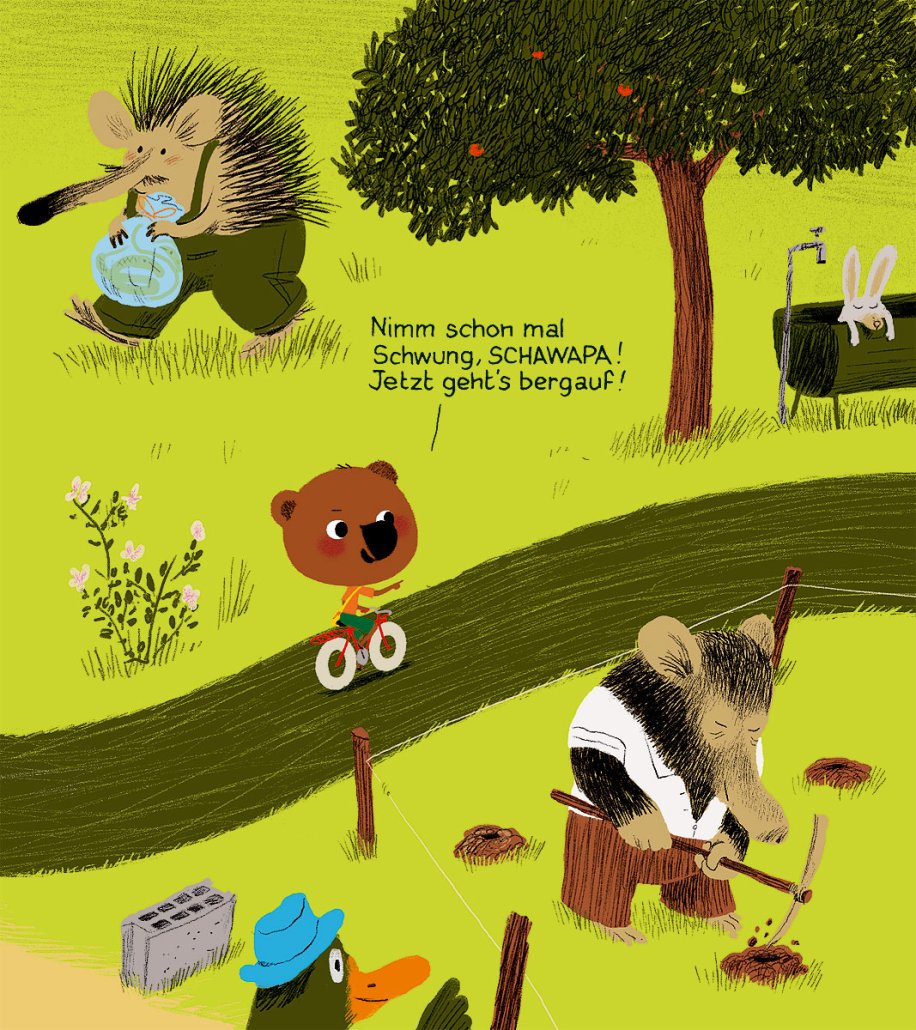 Welch scho¨ner Tag fu¨r eine Radtour! Mouk schwingt sich auf den Drahtesel, holt seine Freunde Chavapa und Popo ab, und schon radeln sie durch Wa¨lder und Felder, bergauf und bergab. Das ko¨nnte ewig so weitergehen! Aber dann klaut ein fieser Dieb Chavapas Fahrrad. Wie gemein! Das scho¨ne Fahrrad. Wie sollen sie jetzt nach Hause kommen? Es wird doch bald Abend. Und Hunger haben sie auch. Chavapa schmollt und Popo will gar nicht aufho¨ren zu maulen. Bis Mouk schließlich der Kragen platzt…Mit dem Ba¨ren Mouk hat Marc Boutavant einen Sympathietra¨ger geschaffen, dessen Erlebnisse farbenfroh und fantasievoll sind, und dabei doch stets die Lebenswelt der jungen Leser spiegeln. Das Buch DIE GROSSE REISE DES KLEINEN MOUK (Carl Hanser Verlag) wurde bereits bei Erscheinen als Kinderbuchklassiker gefeiert.