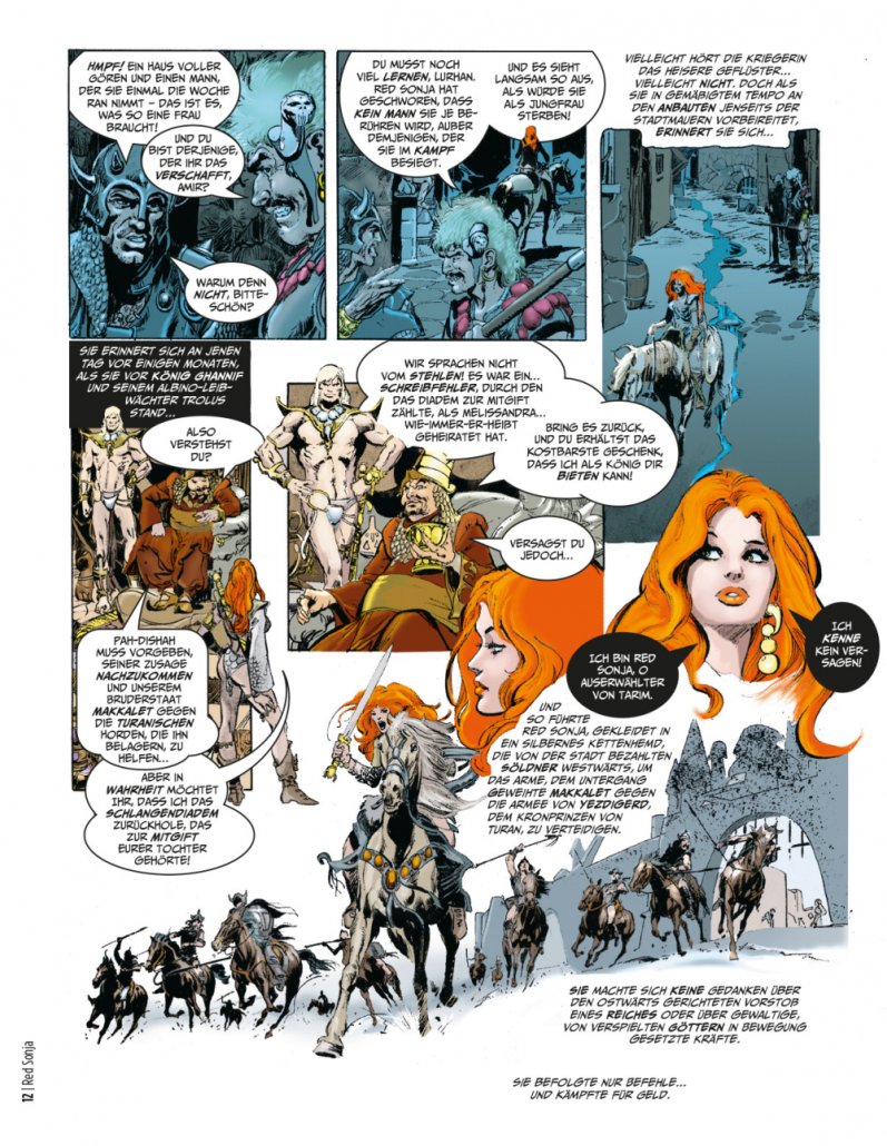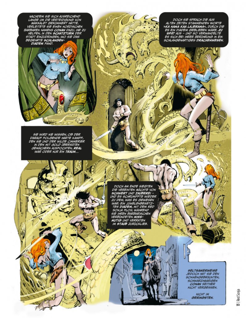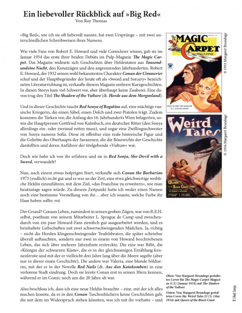 Im Jahr 1973 schufen Roy Thomas und Barry Windsor-Smith mit der Schwertkämpferin Red Sonja eine Ikone des Fantasy-Comics, die sie dem muskelbepackten Barbaren Conan als ebenbürtiges, weibliches Gegenstück zur Seite stellten. Inspiriert wurde die feurige Rothaarige von der ebenso wohlproportionierten wie blutrünstigen Roten Sonya von Rogatine, die einer historischen Erzählung von Conan-Schöpfer Robert E. Howard stammt.
