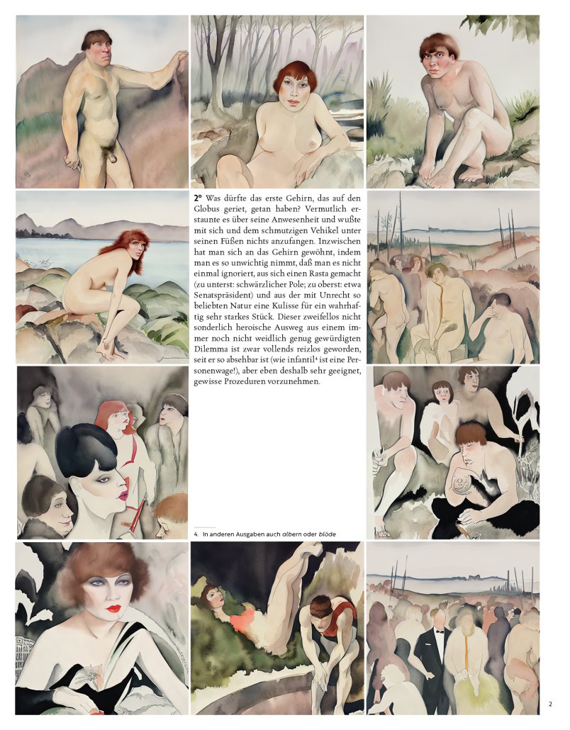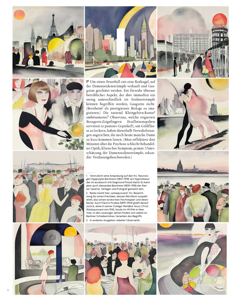 ‚Um einen Feuerball rast eine Kotkugel, auf der Damenseidenstrümpfe verkauft und Gauguins geschätzt werden. Ein fürwahr überaus betrüblicher Aspekt, der aber immerhin ein wenig unterschiedlich ist: Seidenstrümpfe können begriffen werden, Gauguins nicht. (Bernheim als prestigieuser Biologe zu imaginieren.) Die tausend Kleingehirn-Rastas embêtantester Observanz, welche erigierten Bourgeois-Zeigefingern Feuilletonspalten servieren (o pastoses Gepinkel!), um Geldflüsse zu lockern, haben dieserhalb Verwahrlosungen angerichtet, die noch heute manche Dame zu kurz kommen lassen. (Man reflektiere drei Minuten über die Psychose schlecht behandelter Optik; klinisches Symptom, primär: Unterschätzung der Damenseidenstrümpfe; sekundär: Verdauungsbeschwerden.)‘