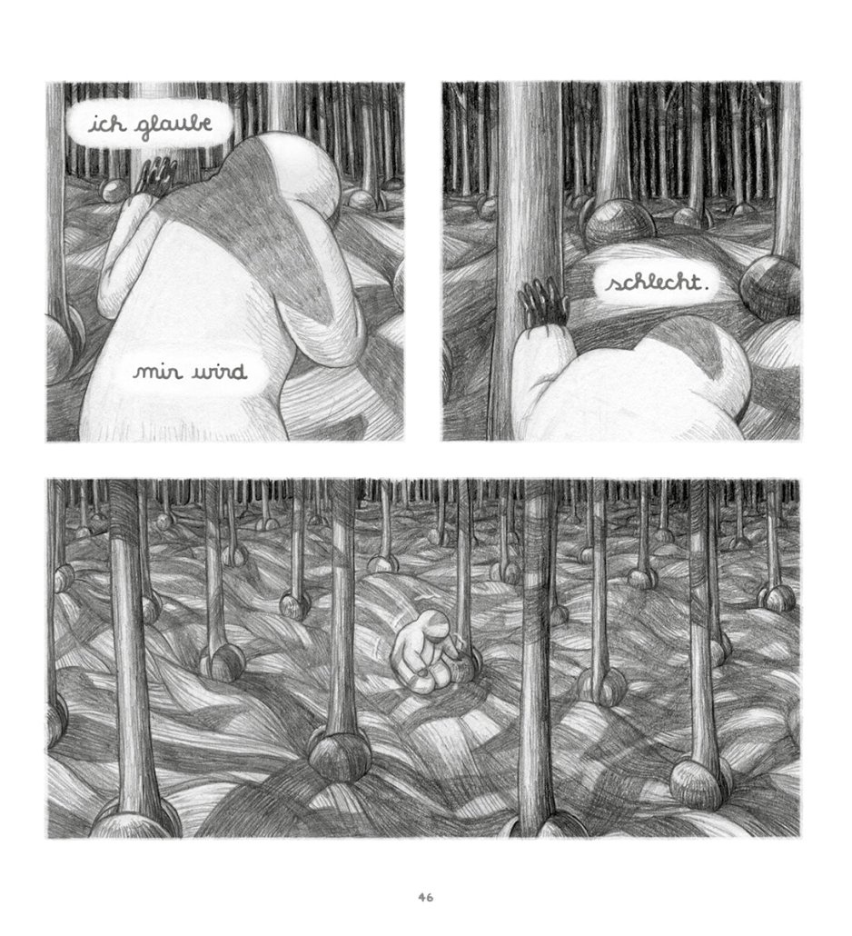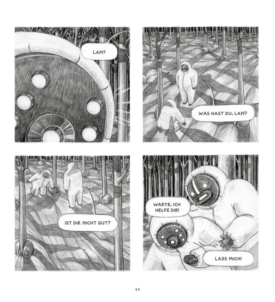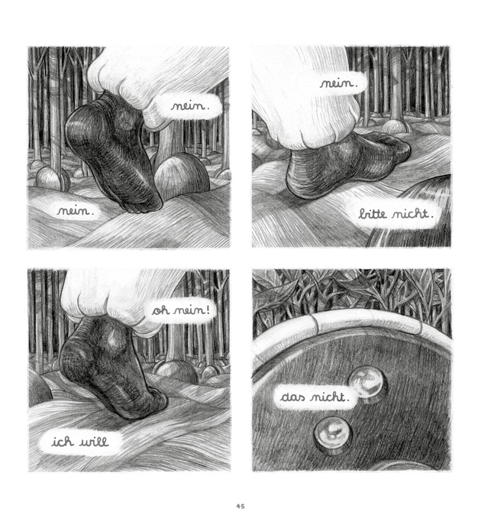 In meisterhaften, detailreichen Bleistiftzeichnungen entführt uns dieses stimmungsvolle Debüt der Hamburger Zeichnerin Judith Kranz in eine geheimnisvolle Welt, die an die Manga von Hayao Miyazaki („Nausicaä aus dem Tal der Winde“) ebenso gemahnt wie an die Zeichenwelten von Anke Feuchtenberger („Genossin Kuckuck“).