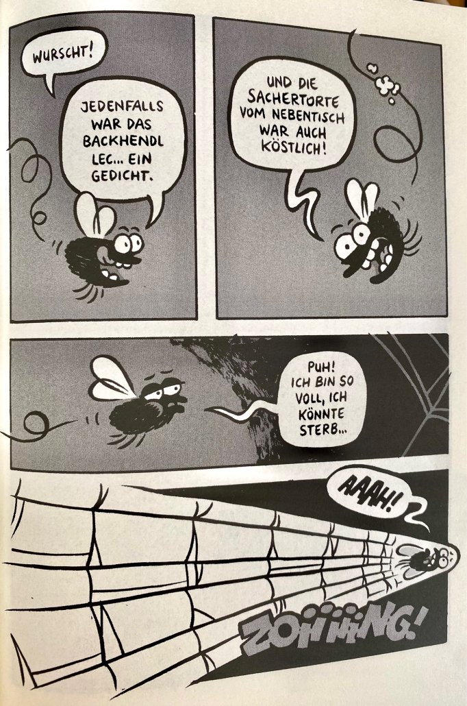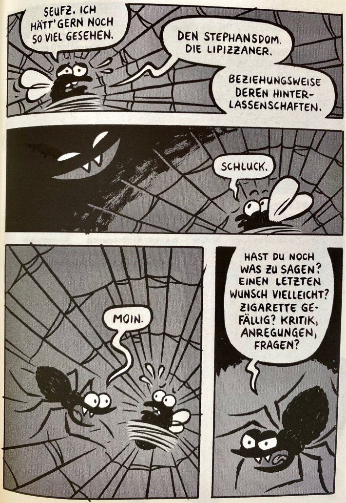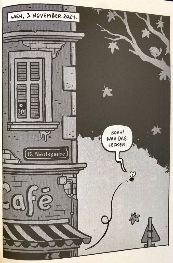 Michael Hacker begann ‚Speiserest in Peace‘ während des 24-Hour Comics Day im November 2024 in Wien. Obwohl er die Geschichte nicht innerhalb der vorgegebenen 24 Stunden abschließen konnte, entschloss er sich, die restlichen Seiten in den darauffolgenden Monaten fertigzustellen. Bon appetit.
