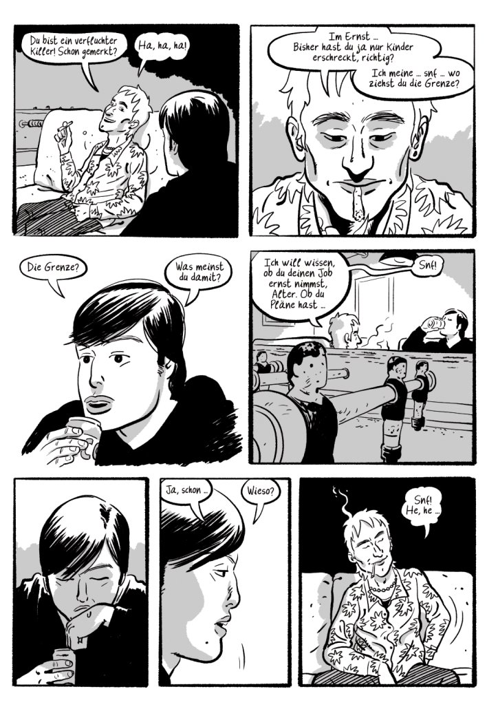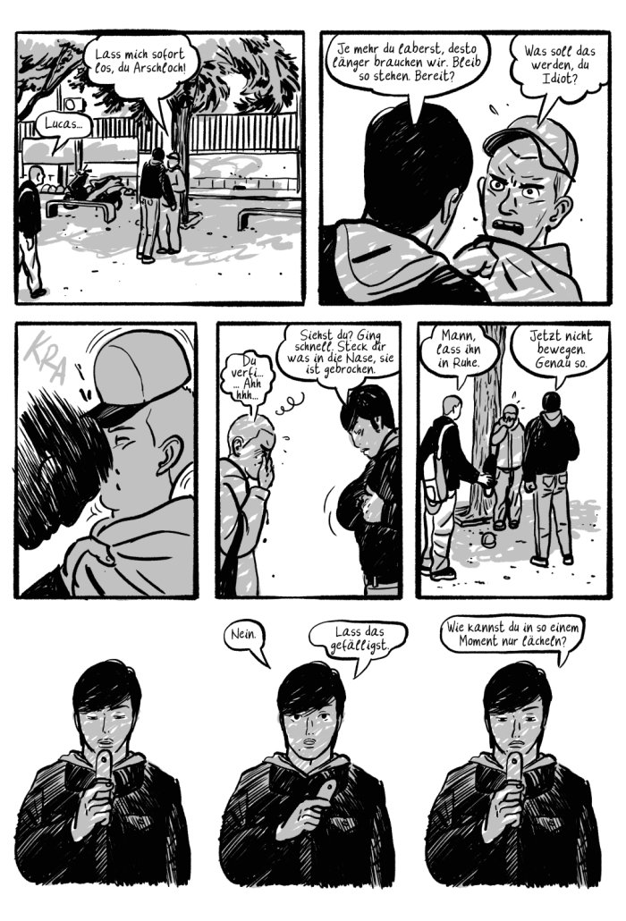 Javi ist 16 Jahre alt, hat die Schule abgebrochen und ist jetzt eine Art bezahlter Auftragsrowdy, der verschiedene Jobs für Schüler erledigt: Racheakte, Wiederbeschaffung gestohlener Handys, gebrochene Nasen und was sonst noch gebraucht wird. Eines Tages erhält er auf einer Party einen etwas anderen Auftrag, und die Sache geht schief …§§Zur gleichen Zeit kommt Jorge in die Stadt und fängt an, für eine Industrieschreinerei zu arbeiten. Sein Kollege Arturo versucht vergeblich, sich mit ihm anzufreunden. Jorge ist ein mysteriöser Mensch, traurig und schweigsam, der eine große Schuld mit sich herumzutragen scheint. Den Ursprung dieses Schuldgefühls kennt nur er, und er muss damit leben.§§Publikumspreis „Bestes Buch“ auf dem Comic-Salon Barcelona 2014
