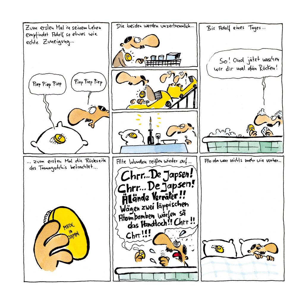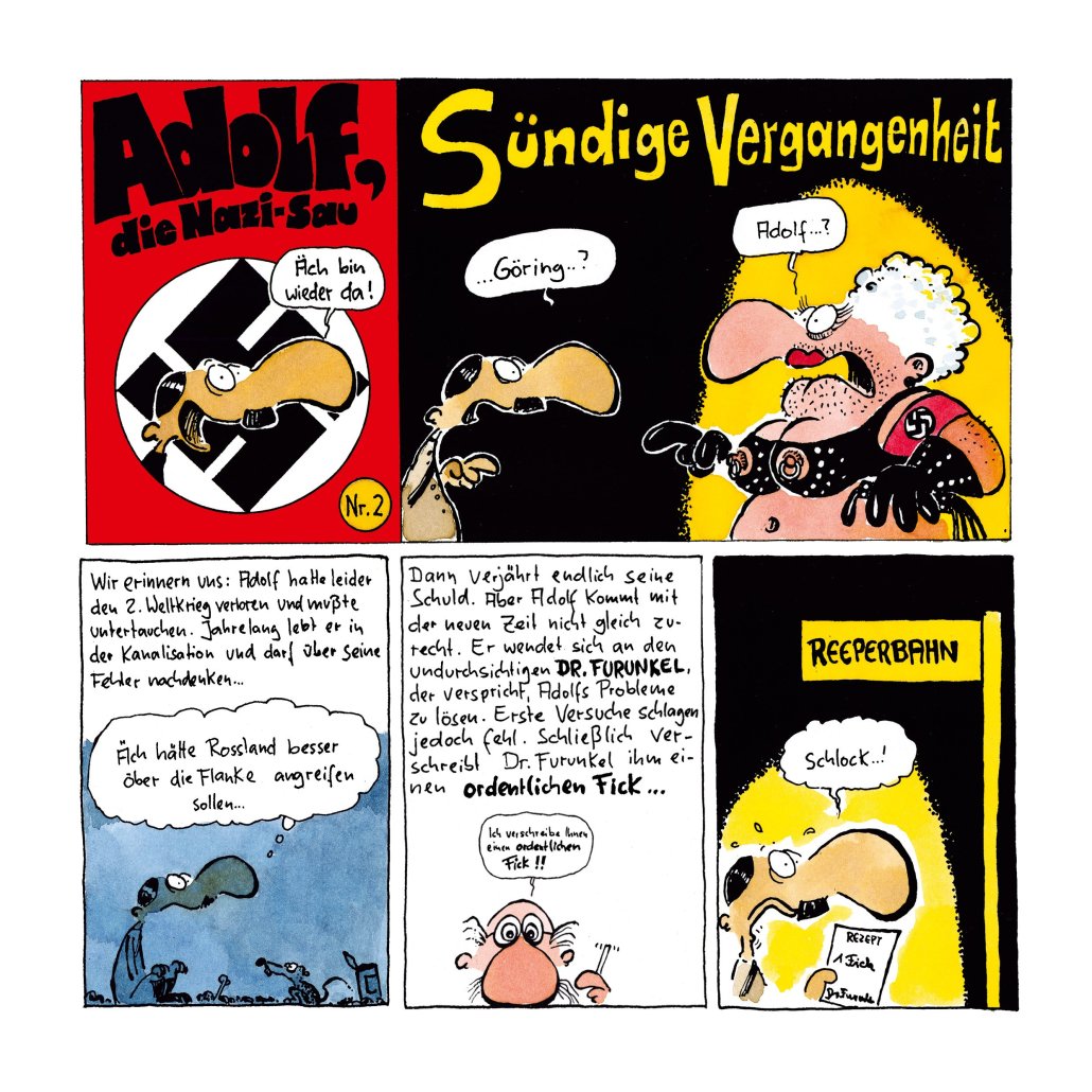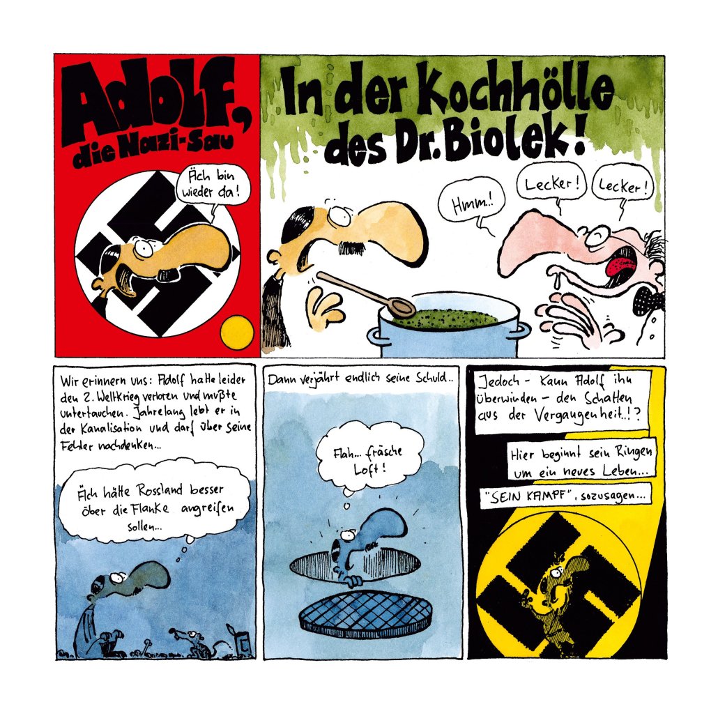 Darf man sich über Nazis lustig machen? Nein, man muss! So lautete der Slogan zu Walter Moers‘ erstem Band ‚Adolf – äch bin wieder da‘, mit denen der Hamburger Bestsellerautor bis heute Maßstäbe setzt in der Hitlerparodie. Ihm folgten ‚Äch bin schon wieder da‘ und der legendäre ‚Bonker‘. Jetzt gibt es erstmals alle Moers-Geschichten um die ‚Nazisau‘ in einem Band – mit zusätzlichem Bonusmaterial.