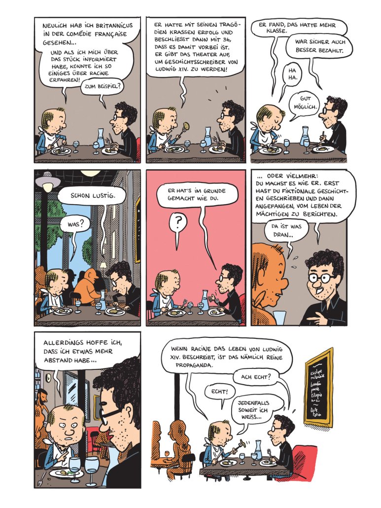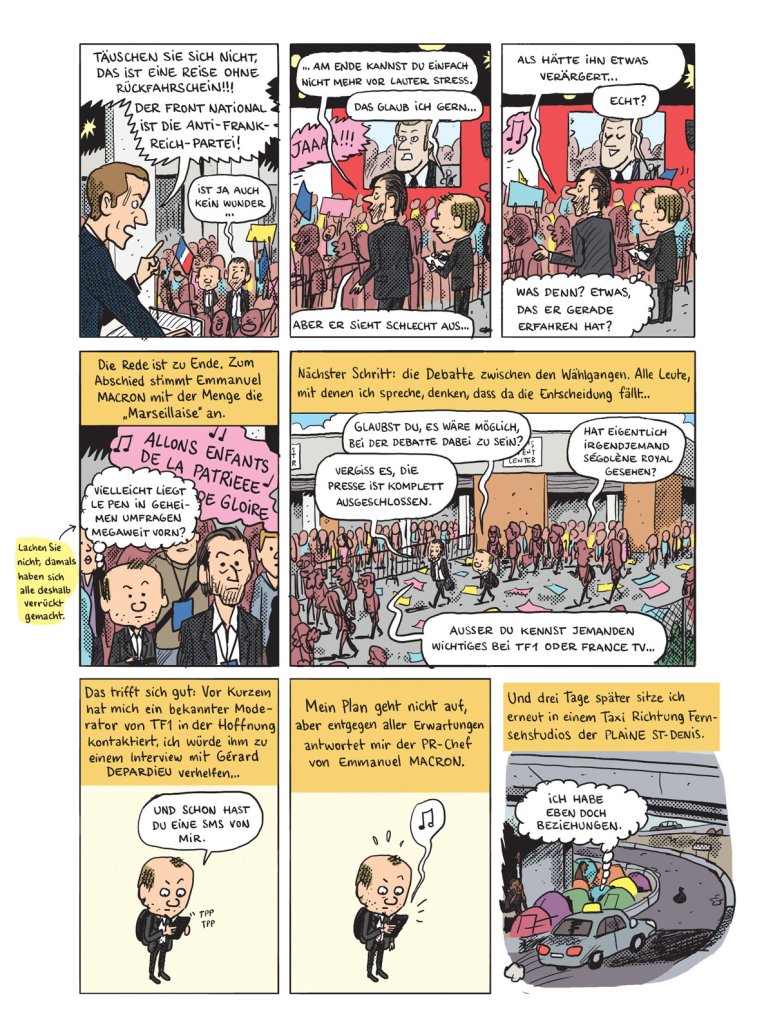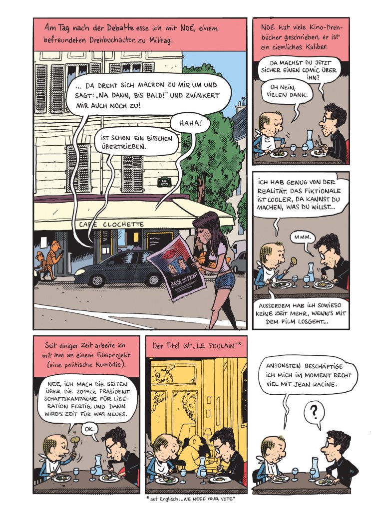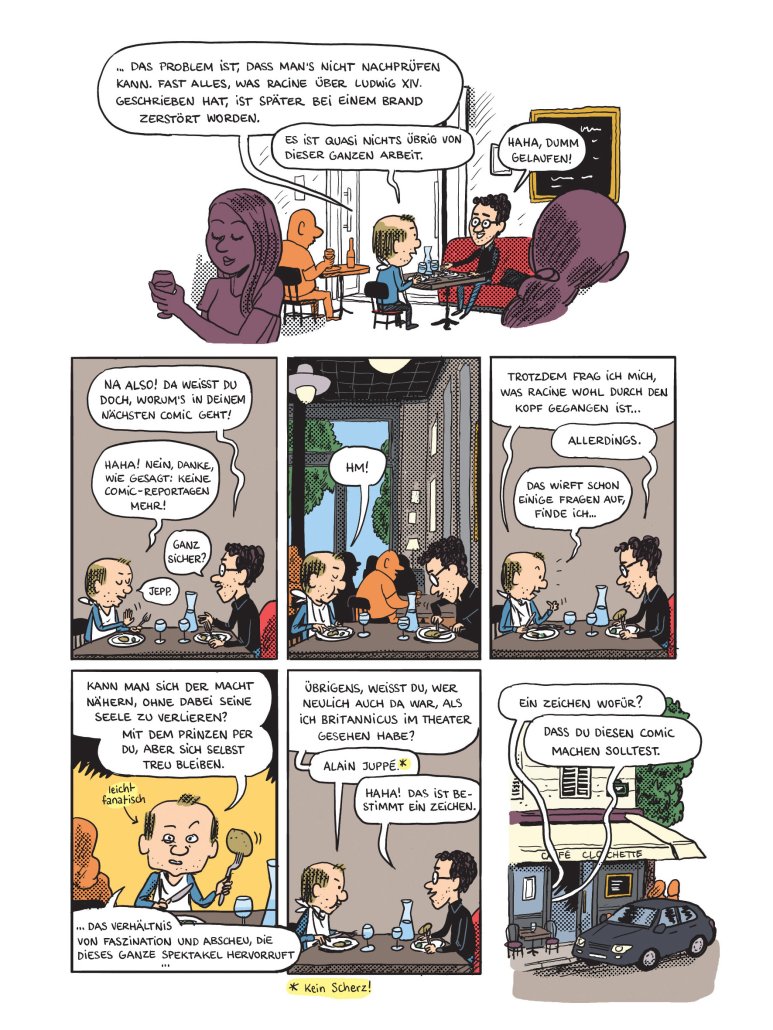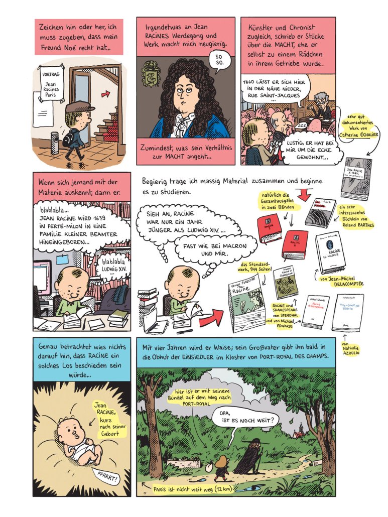 Selbstironisch vergleicht Mathieu Sapin seinen Versuch, den Beginn der Präsidentschaft von Emmanuel Macron auf Papier festzuhalten, mit der Laufbahn Jean Racines, der im 17. Jahrhundert davon träumt, zum Hofberichterstatter des Sonnenkönigs Ludwigs XIV. zu werden. Mathieu Sapin hinterfragt die Verbindung von Kunst und Macht mit Humor und Finesse – unser liebster Comicreporter seit Tim und Struppi!