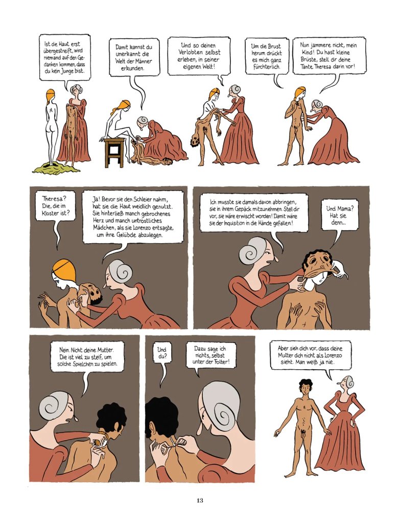 Das Italien der Renaissance. Als die junge Bianca nach dem Willen ihrer Eltern mit einem ihr unbekannten Kaufmann verheiratet werden soll, entdeckt sie das Geheimnis, das die Frauen ihrer Familie über Generationen hinweg bewahrt haben: eine ‚Mannshaut‘! Sobald Bianca diese überzieht, wird sie zu Lorenzo, einem jungen Mann von großer Schönheit. Sie kann nun inkognito die Welt der Männer besuchen und ihren Verlobten kennenlernen. Doch in ihrer Männerhaut befreit sich Bianca zusehends von den den Frauen ihrer Zeit auferlegten Grenzen und entdeckt die Liebe und die Sexualität.