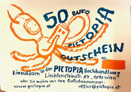 Der 50,00,- Euro PICTOPIA Gutschein nach einem Design von Nicolas Mahler und siebgedruckt von SOYBOT: Das perfekte Geschenk für Comicleser:innen und solche, die es werden wollen.